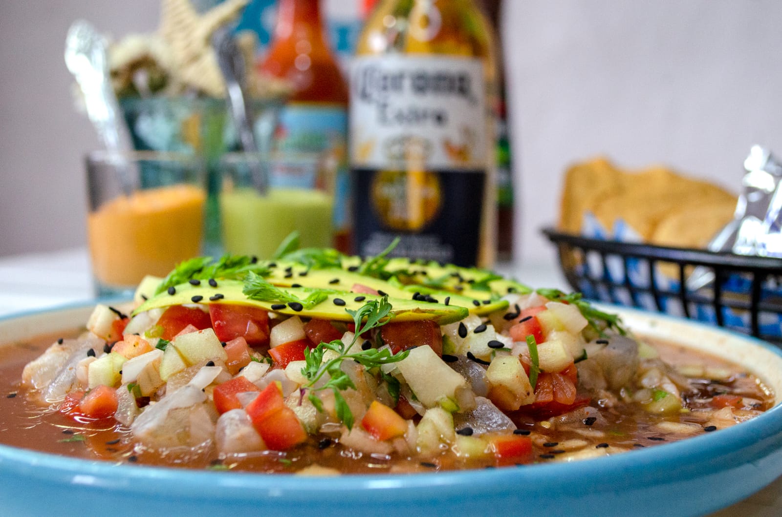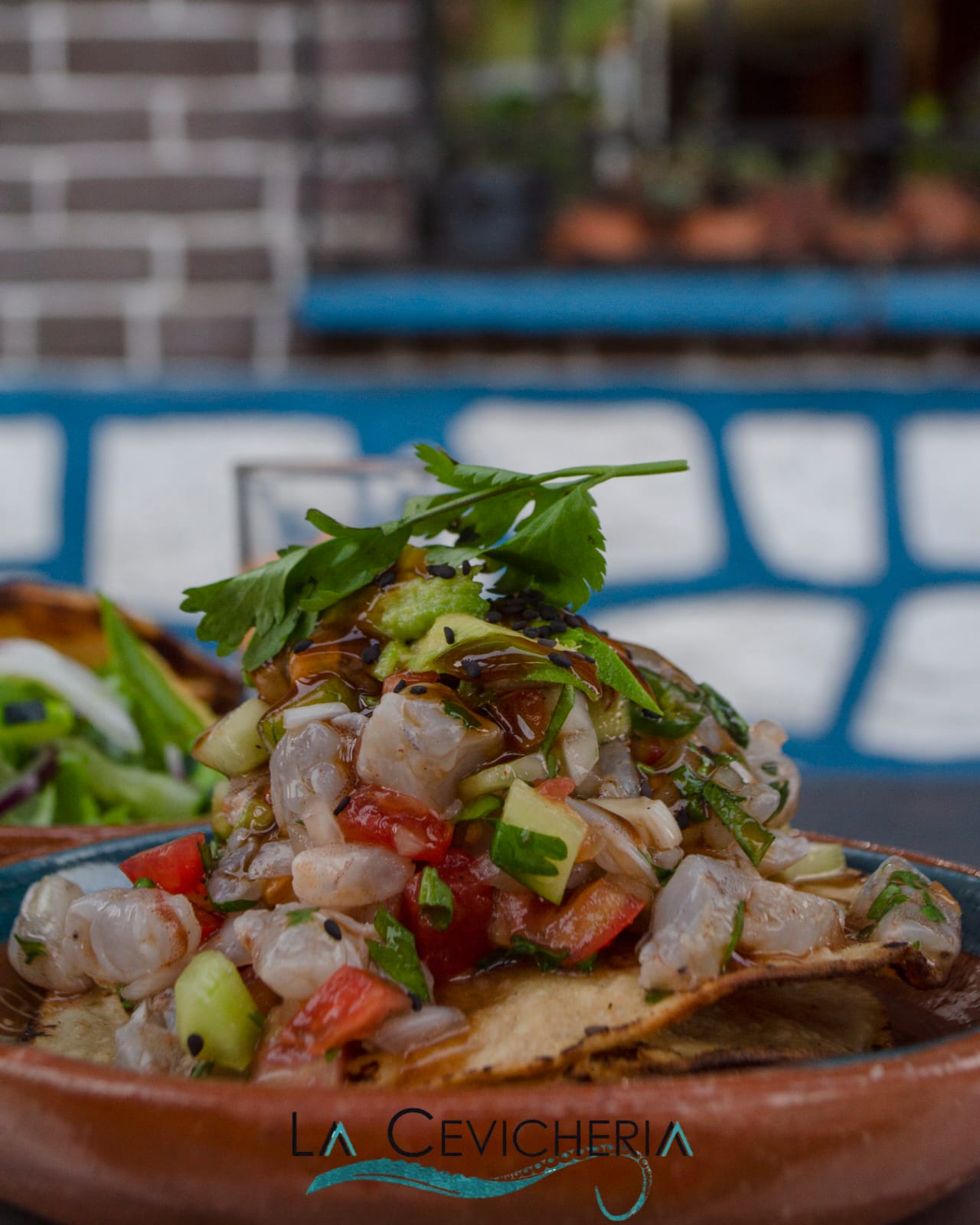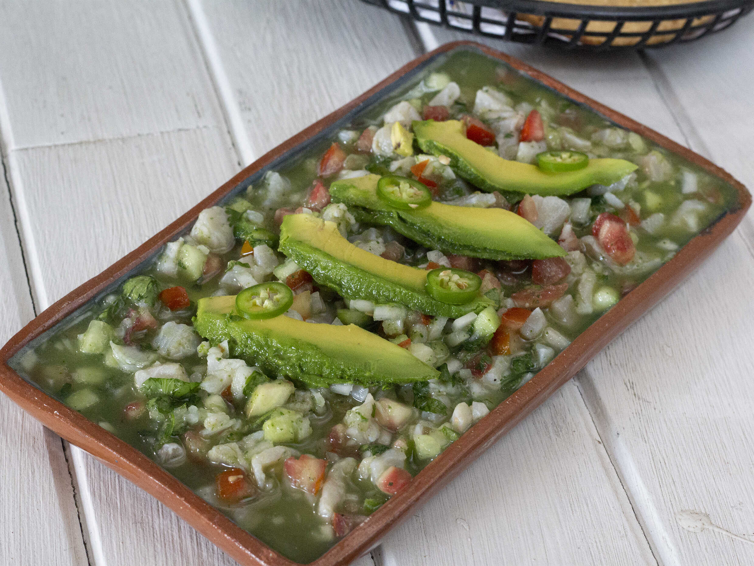Deliciosos trocitos de pescado curtido en limón y aguachile verde o rojo de la casa, con cebolla, pepino, cilantro, y aguacate. Incluye tostadas, galletas, aderezo de cilantro y salsa.