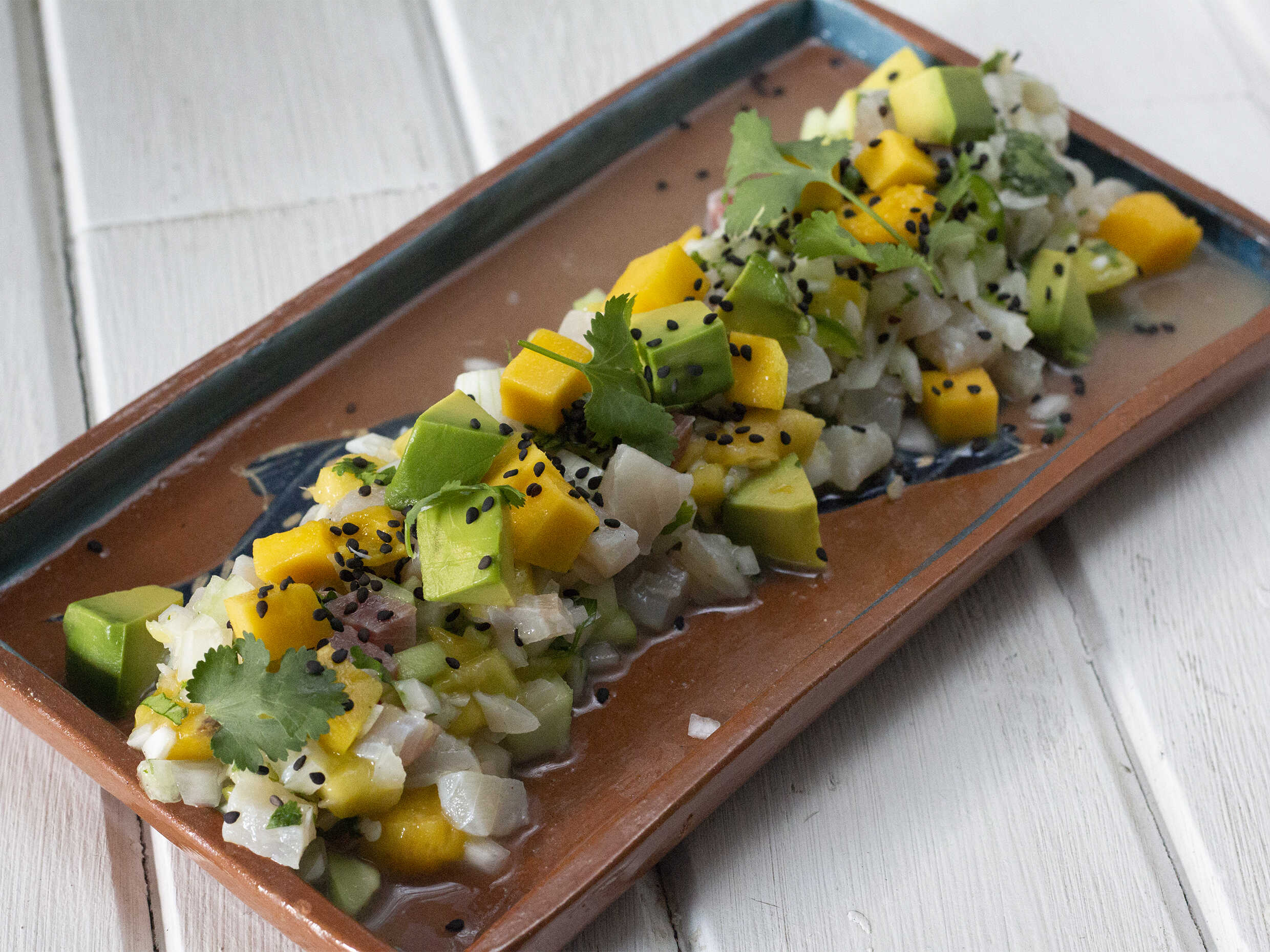 Ceviche de pescado marinado en jugo de limón y camarón cocido troceado, con cebolla, pepino, cilantro, mango y toque de maracuyá