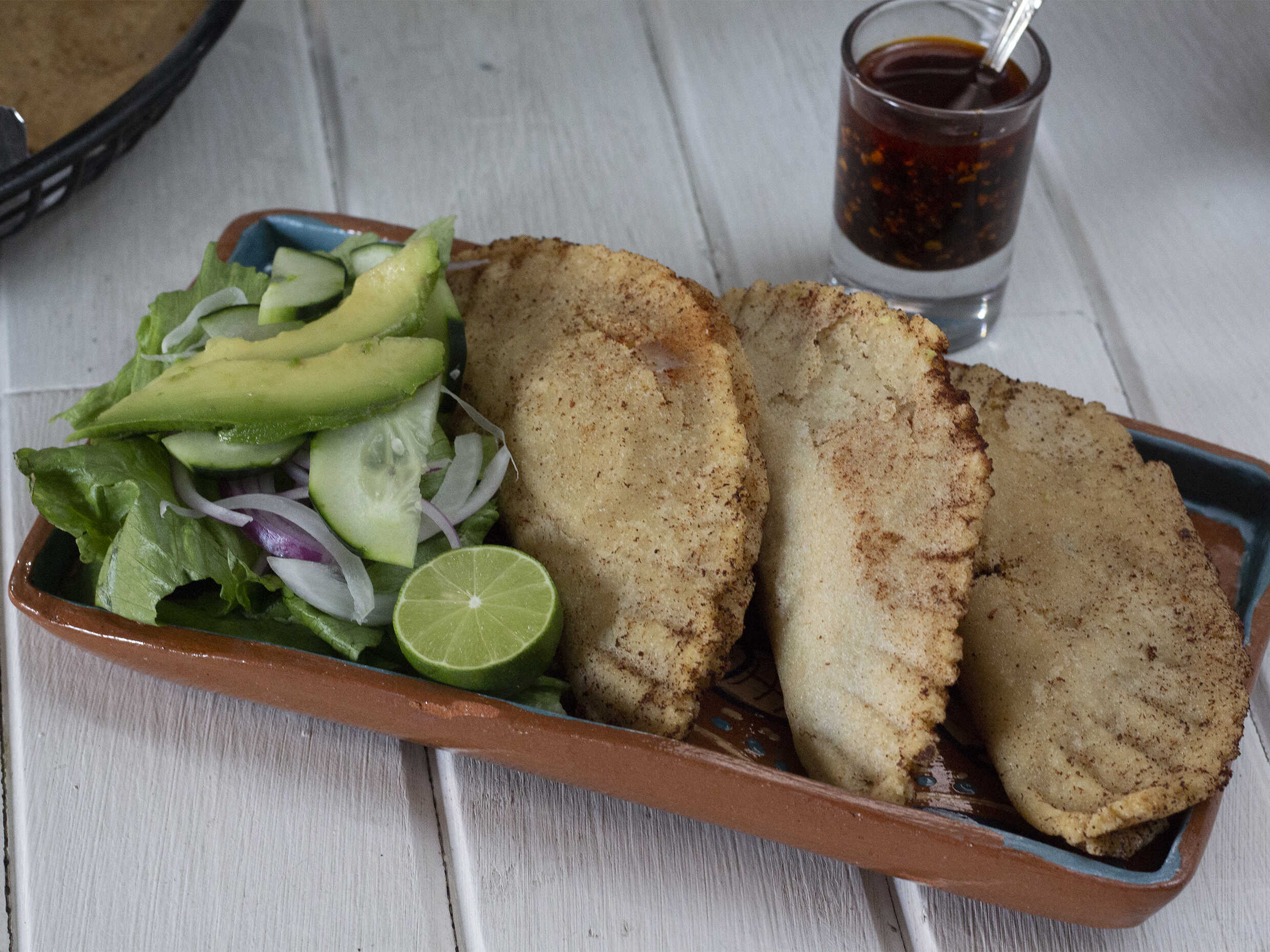 Quesadilla frita con ensalada y salsa de morita con cacahuate