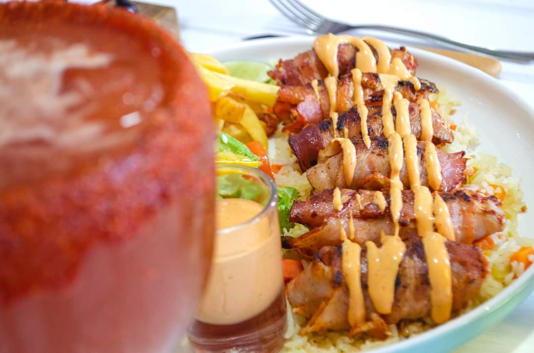 Deliciosos camarones envueltos en tocino, rellenos de marlín y queso gratinado. acompañados de sopa de arroz, ensalada fresca, papas a la francesa, aderezo y tostadas.
