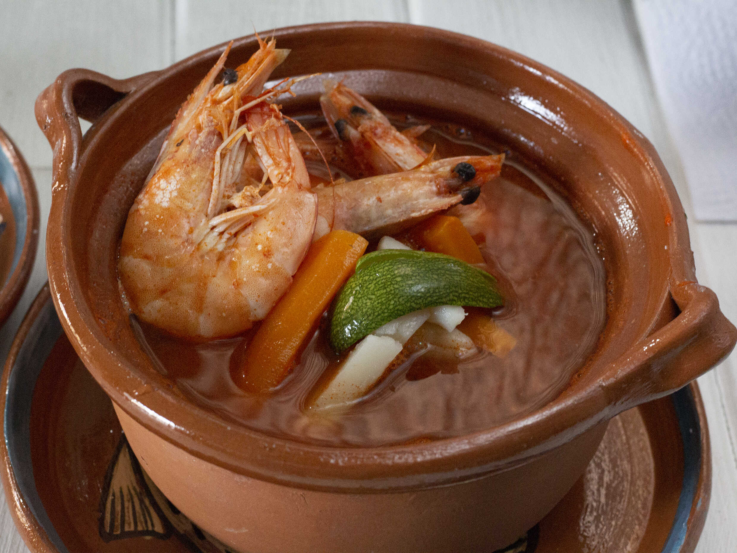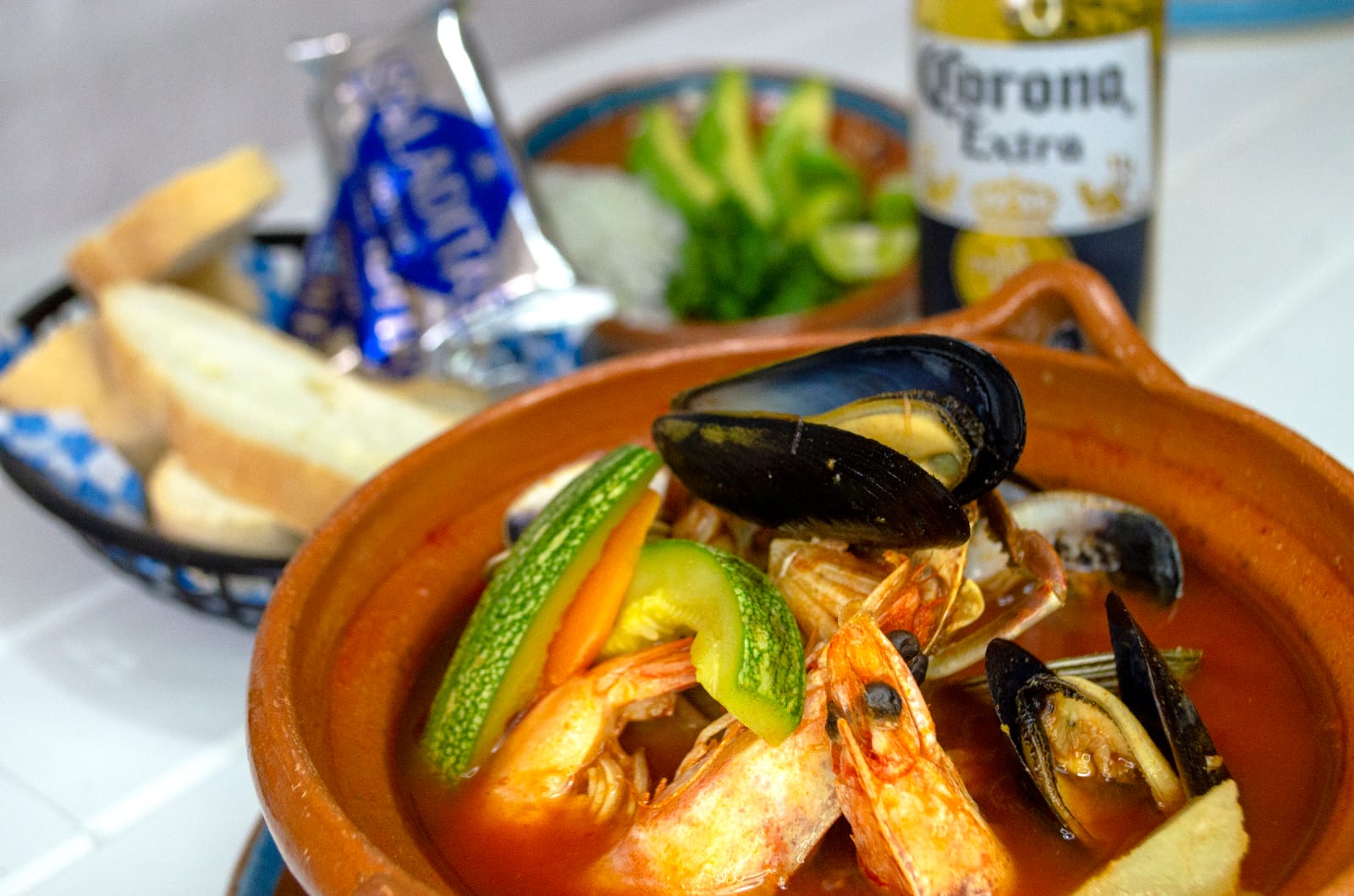 Caldo de mariscos con jaiba, almeja, mejillón, pescado y camarón en caldo rojo de guajillo. Acompañado de cilantro cebolla aguacate limón y pan o tostadas.