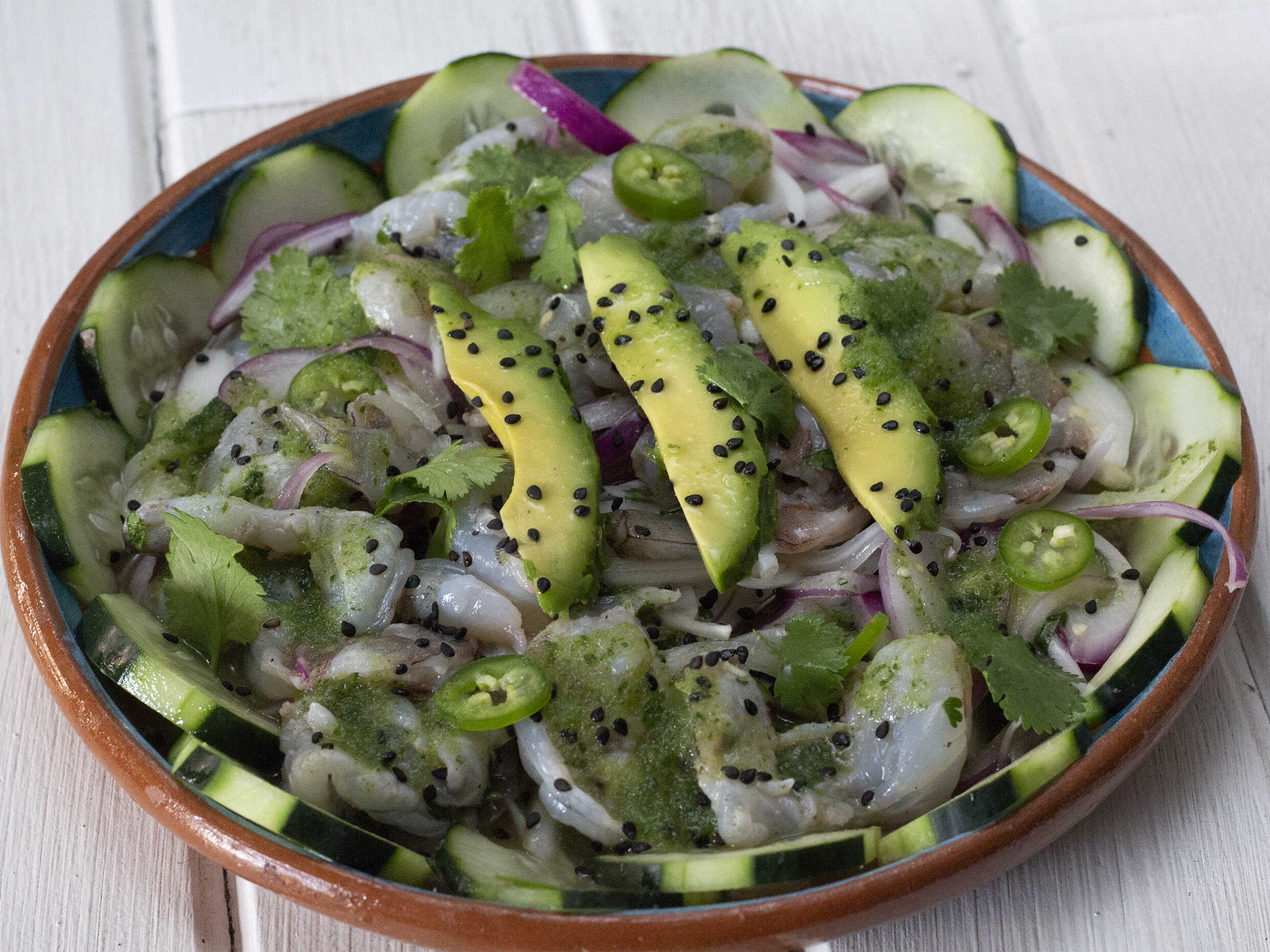 Con camarón fresco recién cocido, mezclado con cubitos de aguacate, cebolla blanca y morada, lechuga fresca, pepino, aderezo verde y un toque de aceite de oliva y ajonjolí negro. Incluye tostadas galletas aderezo de cilantro y salsa.