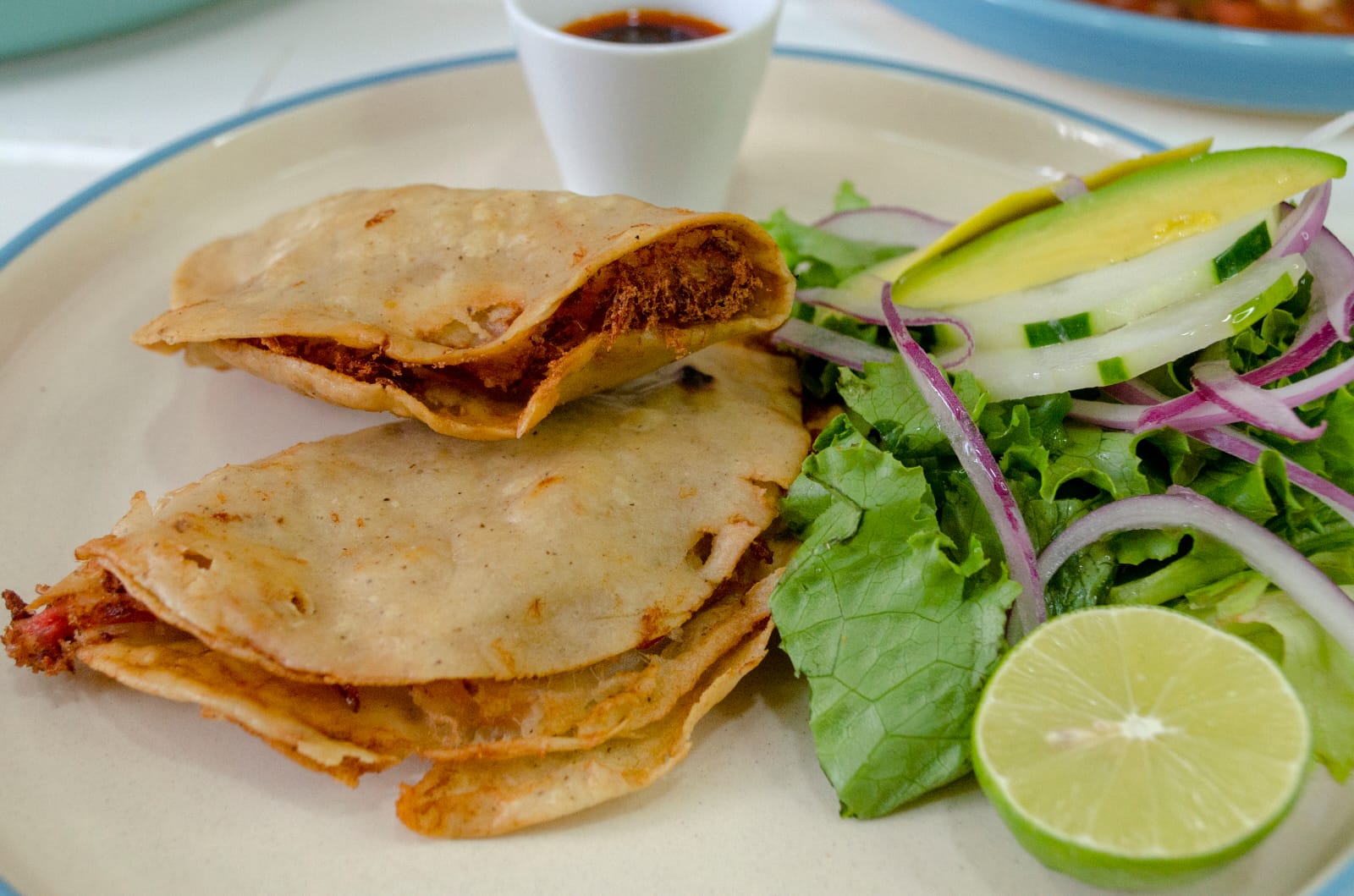 Quesadilla frita, con ensalada y salsa de morita con cacahuate