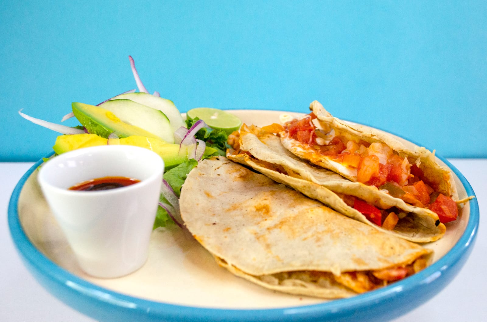 Tortilla de harina, acompañado de frijol refrito, ensalada semi fría, aguacate y aderezo de chipotle.