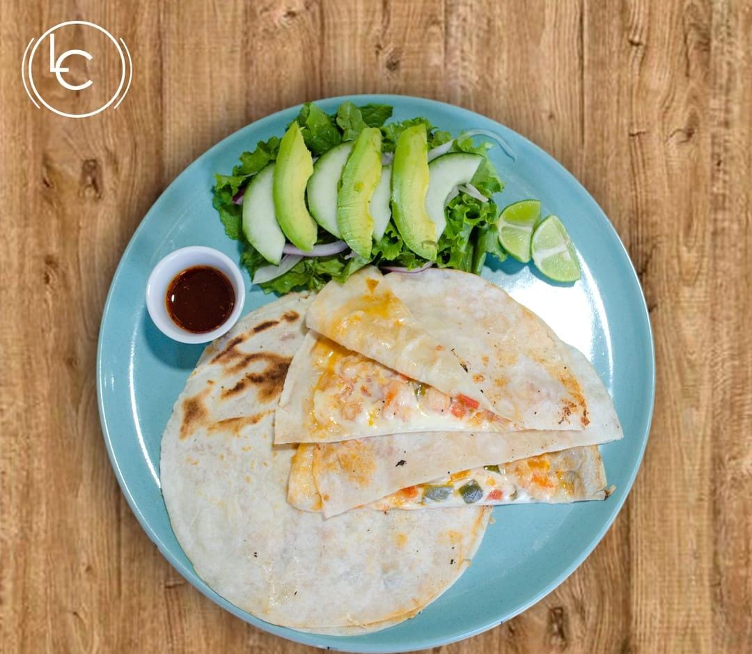 Tortilla de harina sincronizada rellena de queso y tú guisado favorito (marlín, machaca de camarón o pulpo) acompañada de ensaladita fresca y aderezo de chipotle. (1pz.)