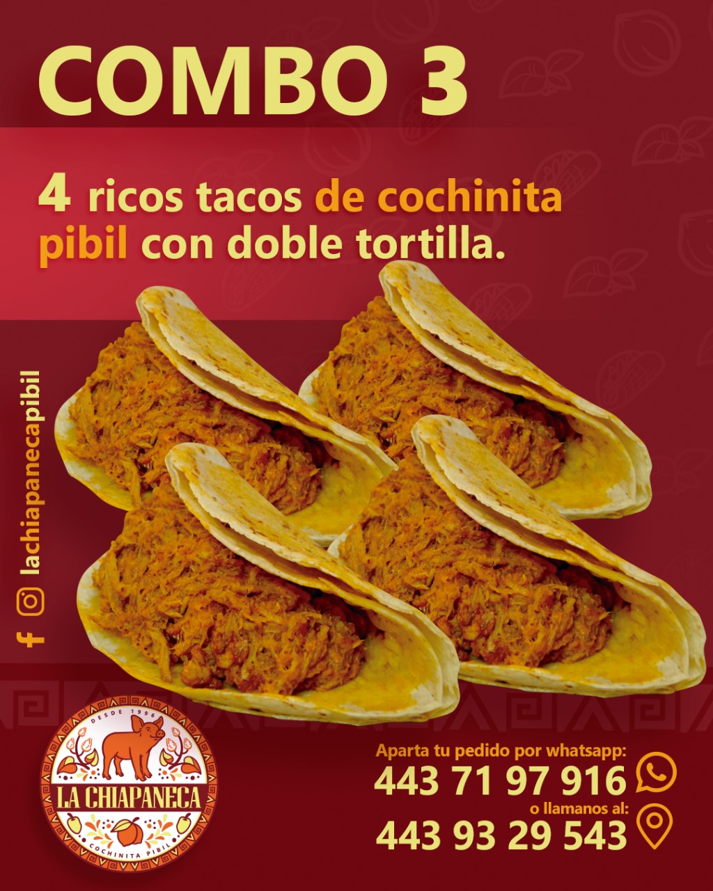 Cuatro tacos con doble tortilla de tortillería con 50 g de nuestra deliciosa cochinita pibil estilo Chiapas.