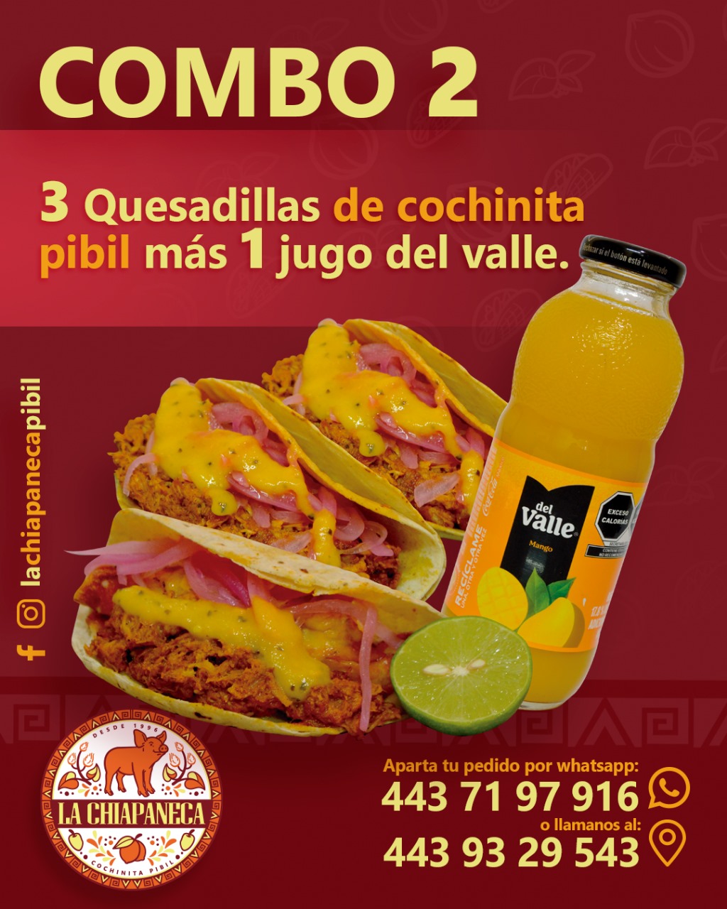 Dos quesadillas con doble tortilla de tortillería con costra de queso asadero, frijol negro y 50 g de nuestra deliciosa cochinita pibil estilo Chiapas, con un jugo del Valle 413 ml de durazno o mango.