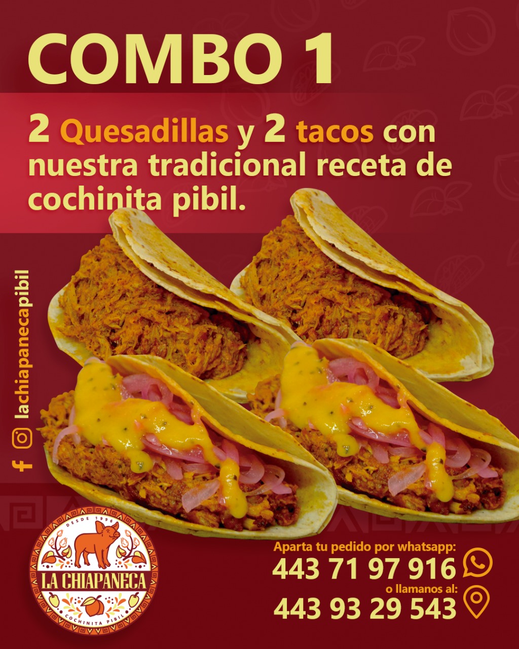 Dos quesadillas con doble tortilla de tortillería con costra de queso asadero, frijol negro y 50 g de nuestra deliciosa cochinita pibil estilo Chiapas, con dos tacos con doble tortilla de tortillería con 50 g de nuestra deliciosa cochinita pibil estilo Chiapas.