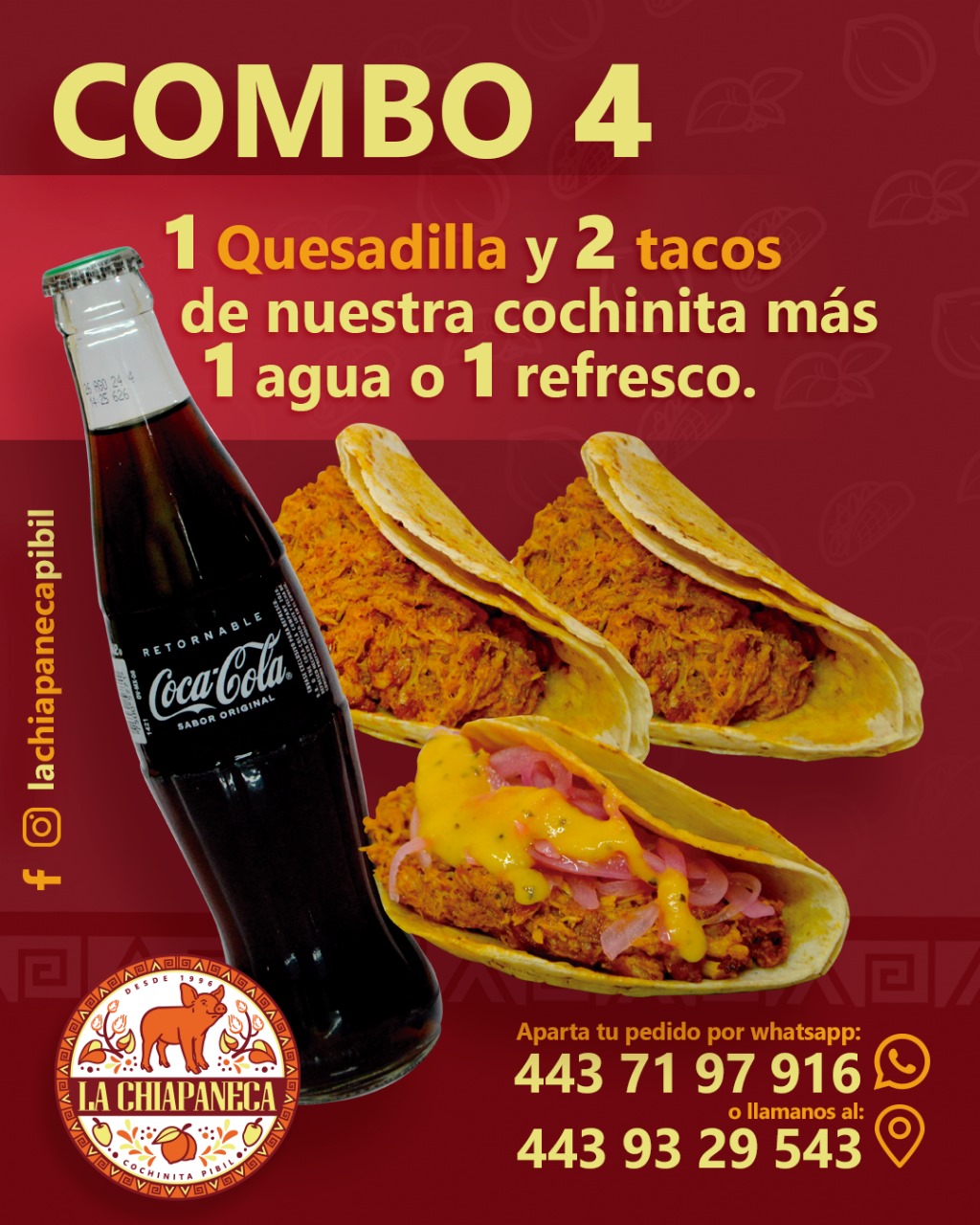Una quesadilla con doble tortilla de tortillería con costra de queso asadero, frijol negro y 50 g de nuestra deliciosa cochinita pibil estilo Chiapas, dos tacos con doble tortilla de tortillería con 50 g de nuestra deliciosa cochinita pibil estilo Chiapas y un agua de sabor del día o un refresco de taparrosca 400 ml Coca Cola, Sprite o Sidral Mundet.
