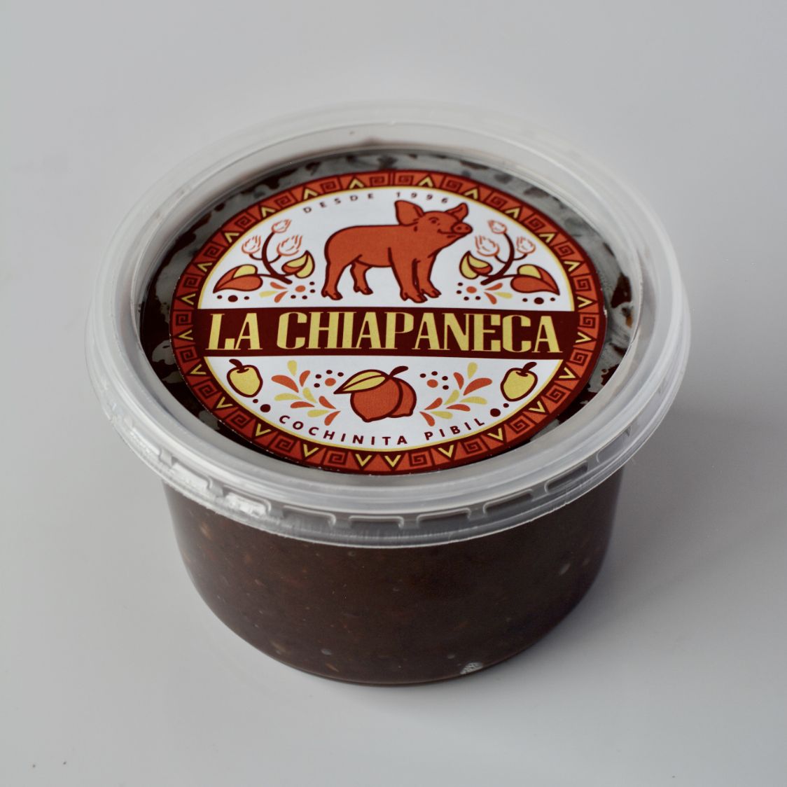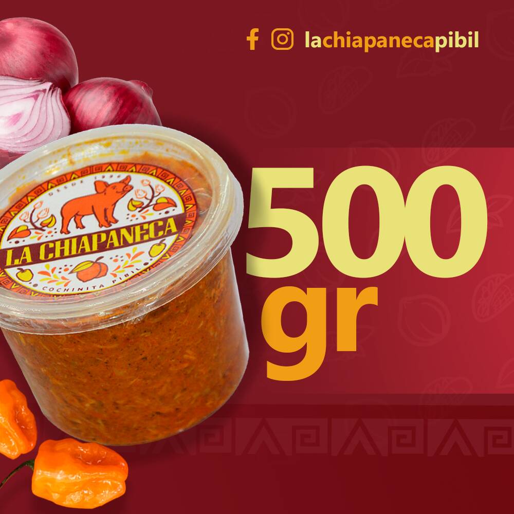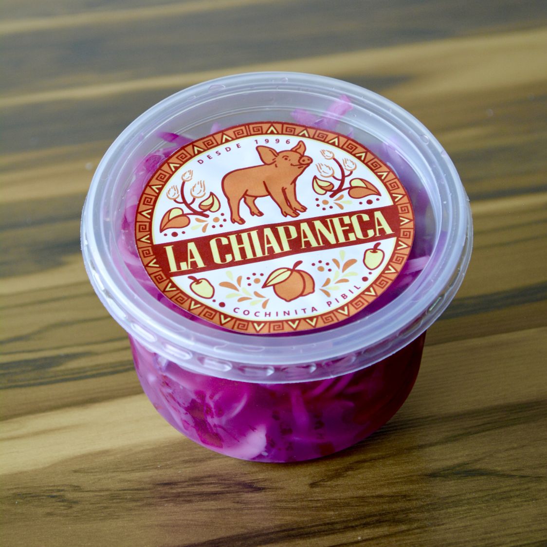 Medio kilo de cochinita pibil estilo Chiapas con 2 oz de salsa habanero y un bote de 1/4 L de cebollas moradas.