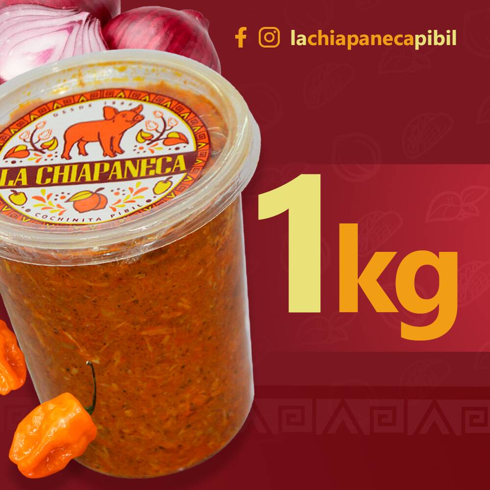 Kilo de cochinita pibil estilo Chiapas con 4 oz de salsa habanero y un bote de 1/2 L de cebollas moradas.