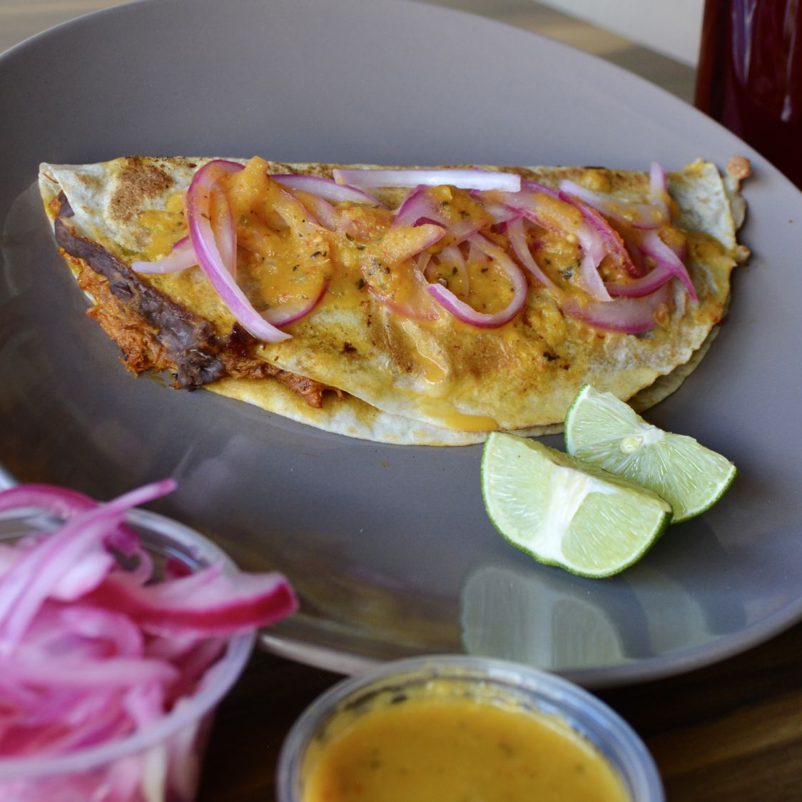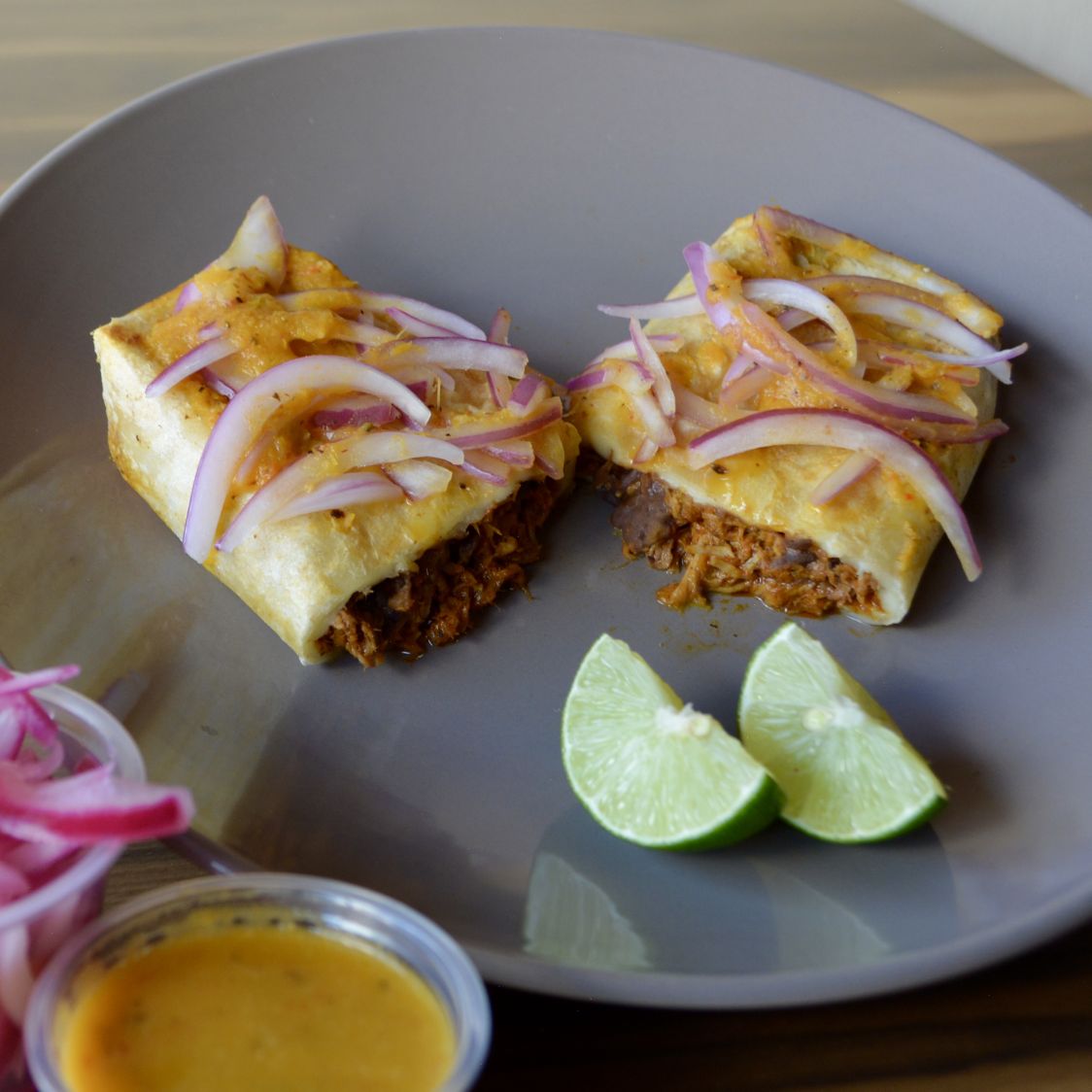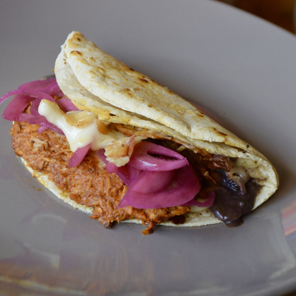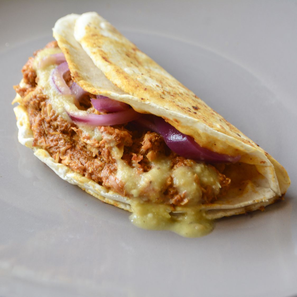 Tortilla de harina grande doblada a la mitad con costra de queso asadero, frijoles y 80 g de nuestra deliciosa cochinita pibil estilo Chiapas.