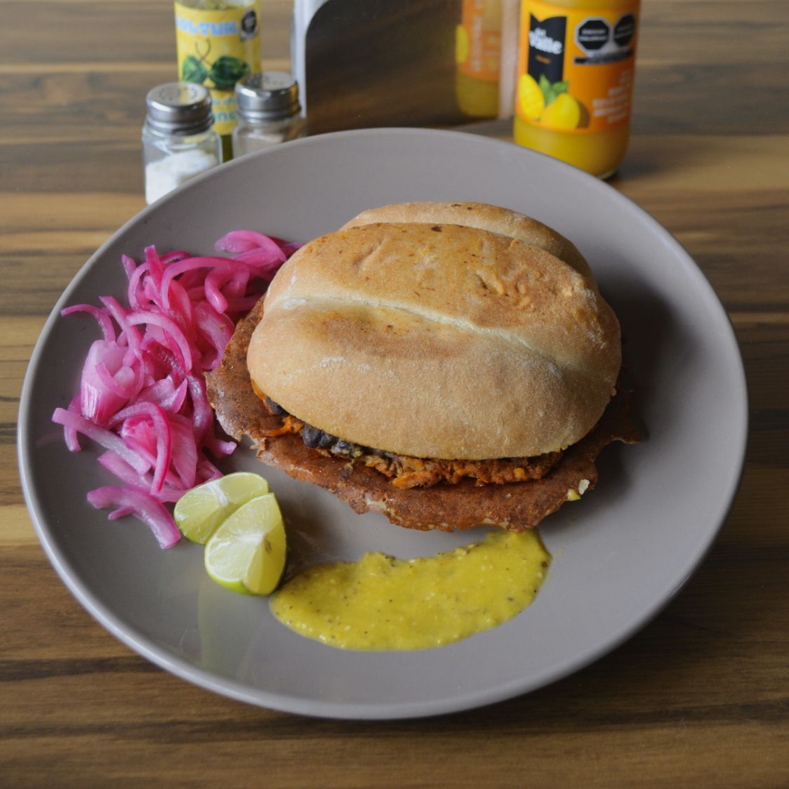 Rico bolillo calientito con costra de queso, frijoles negros y 120 gr. de nuestra tradicional cochinita pibil estilo chiapas.