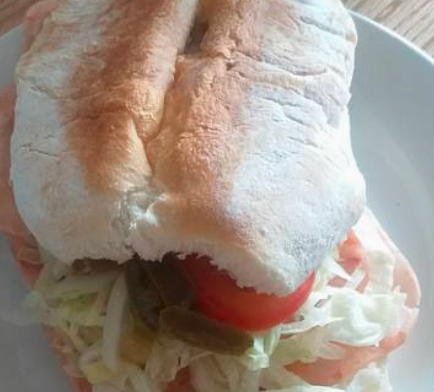 Con milanesa , lechuga, jitomate, cebolla y chiles en vinagre.
