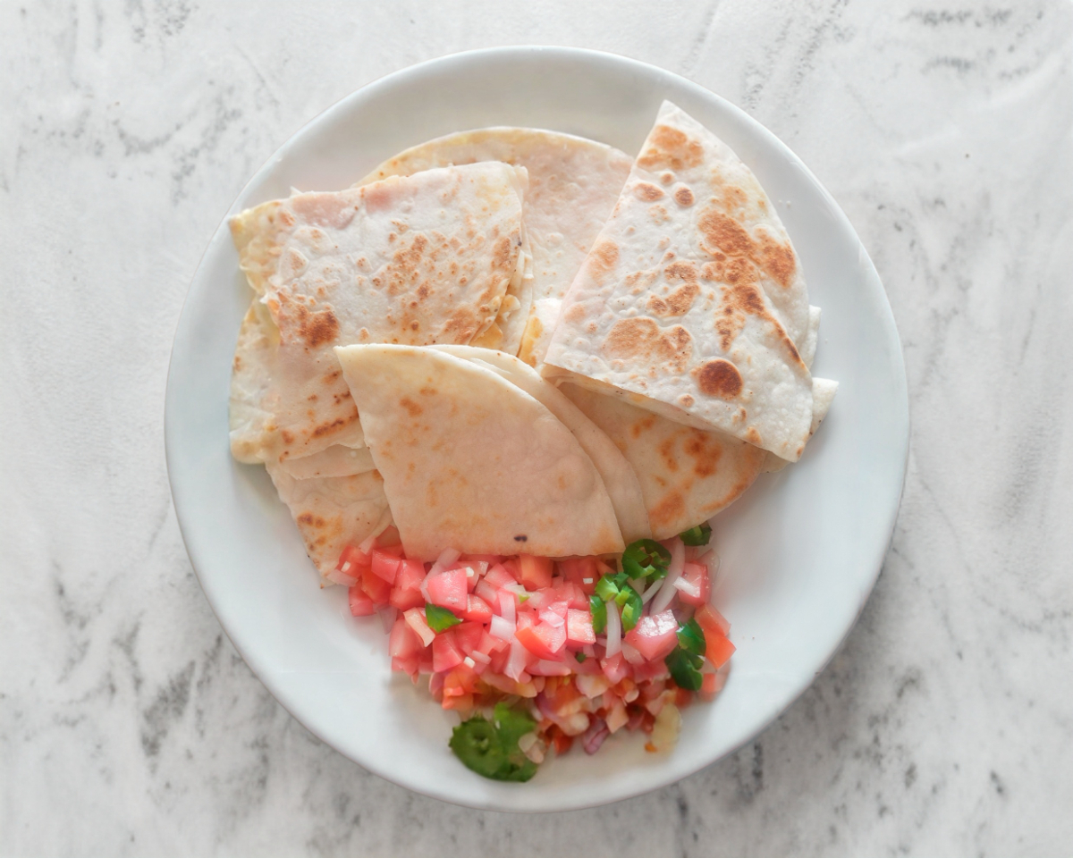 De tortilla de harina, rellenas de jamón, queso oaxaca y queso amarillo y pico de gallo.