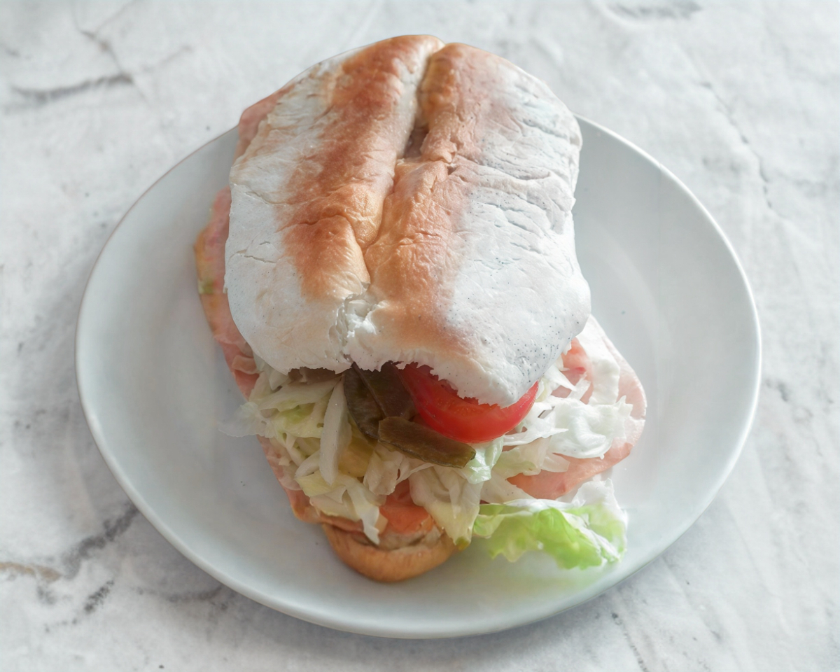 Con queso amarillo, mayonesa, lechuga, jitomate, cebolla y chiles en vinagre.