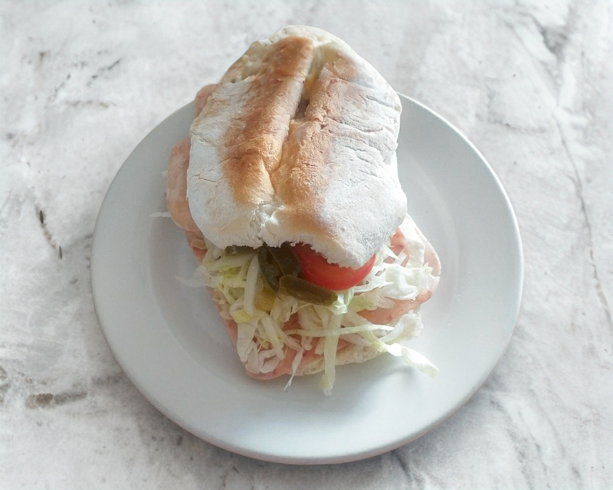 Con mayonesa, lechuga, jitomate, cebolla y chiles en vinagre.