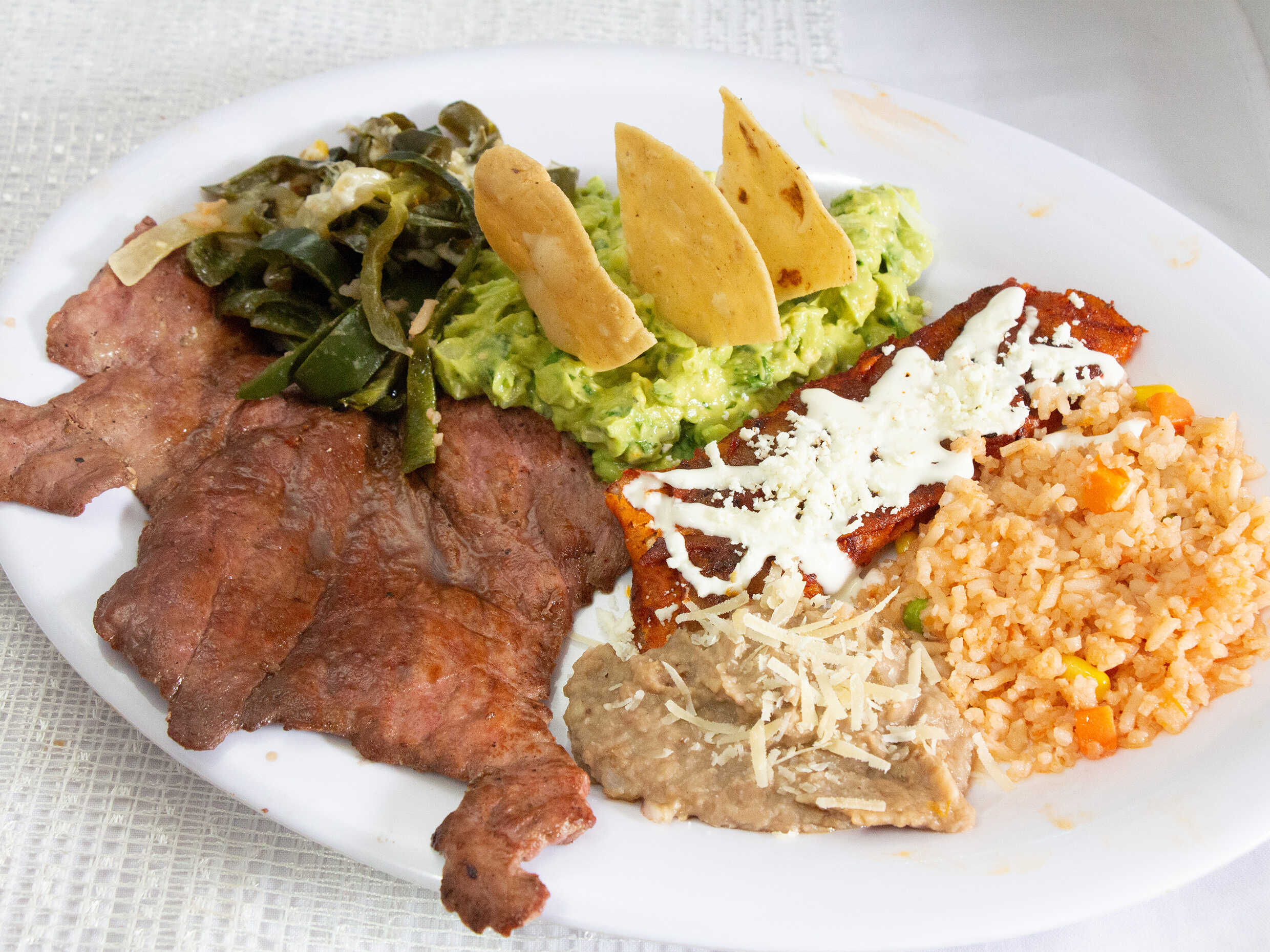 dos guisados dos guarniciones y una bebida (brocheta rajas aporreadillo carne de puerco chile negro pollo con mole chichsrron y cochinita pibil