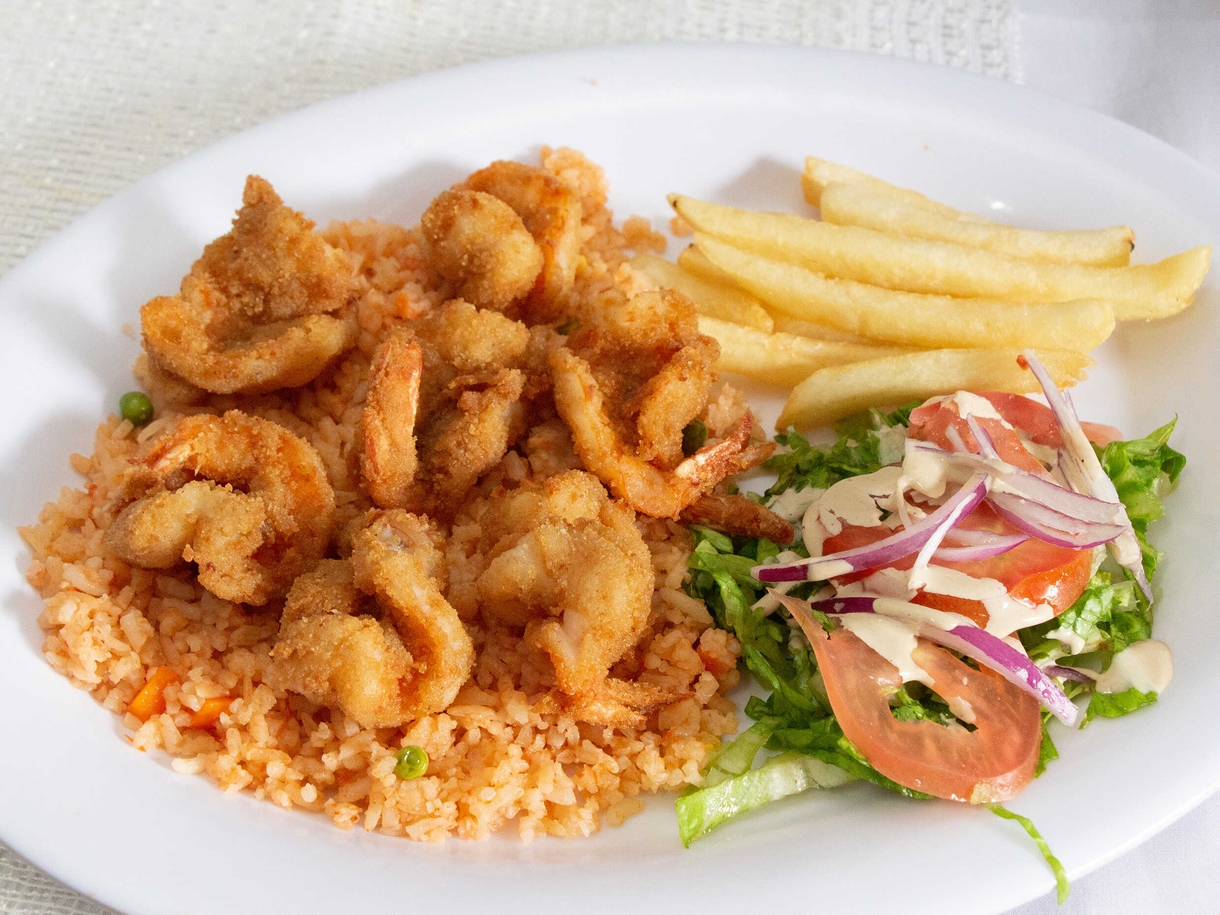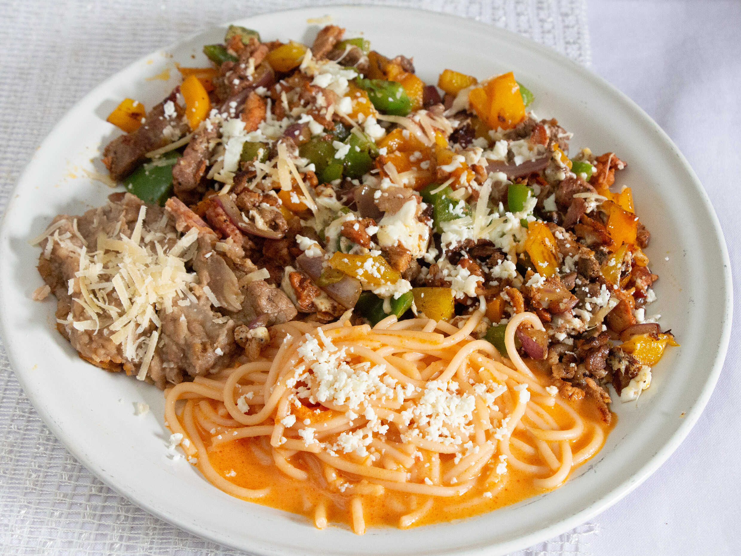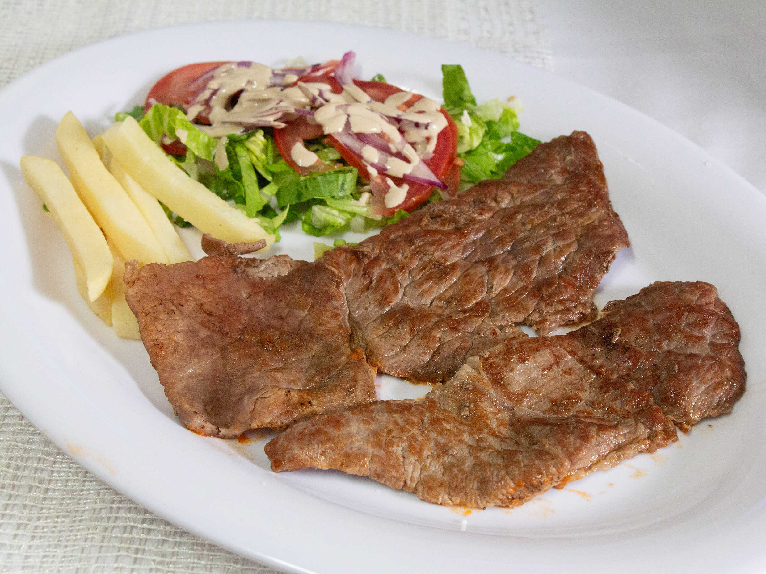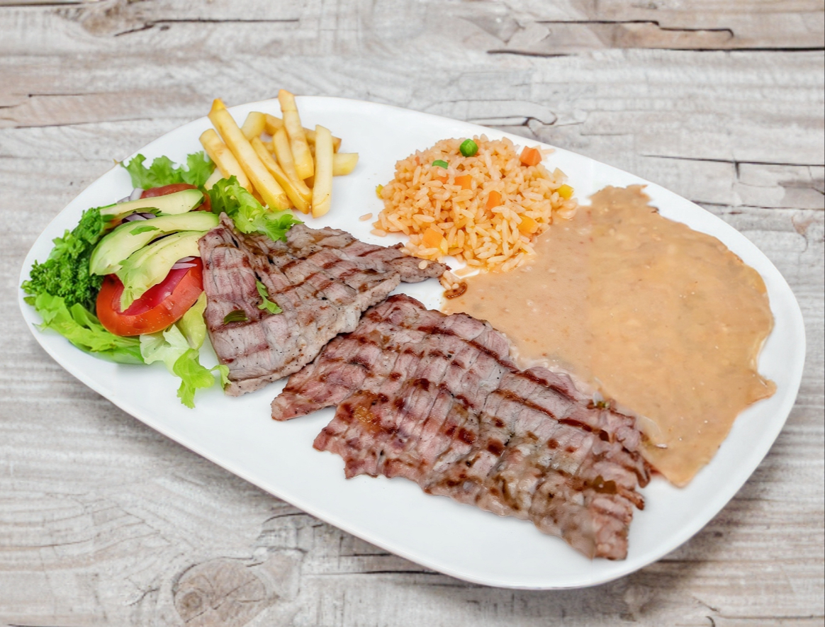 ensalada papas fritas y dos guarniciones ( arroz , frijoles , espaguety dos a elegir )