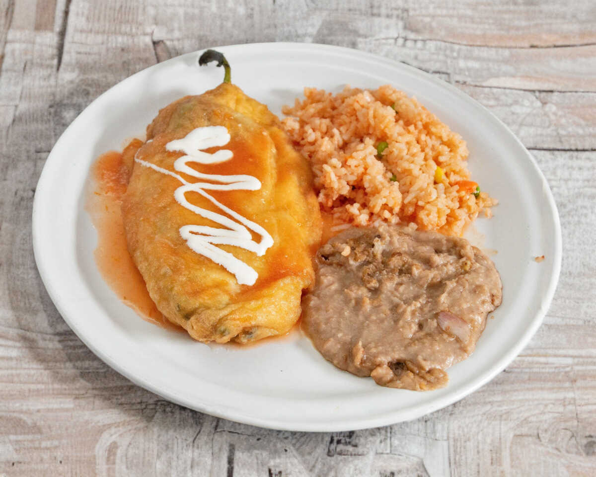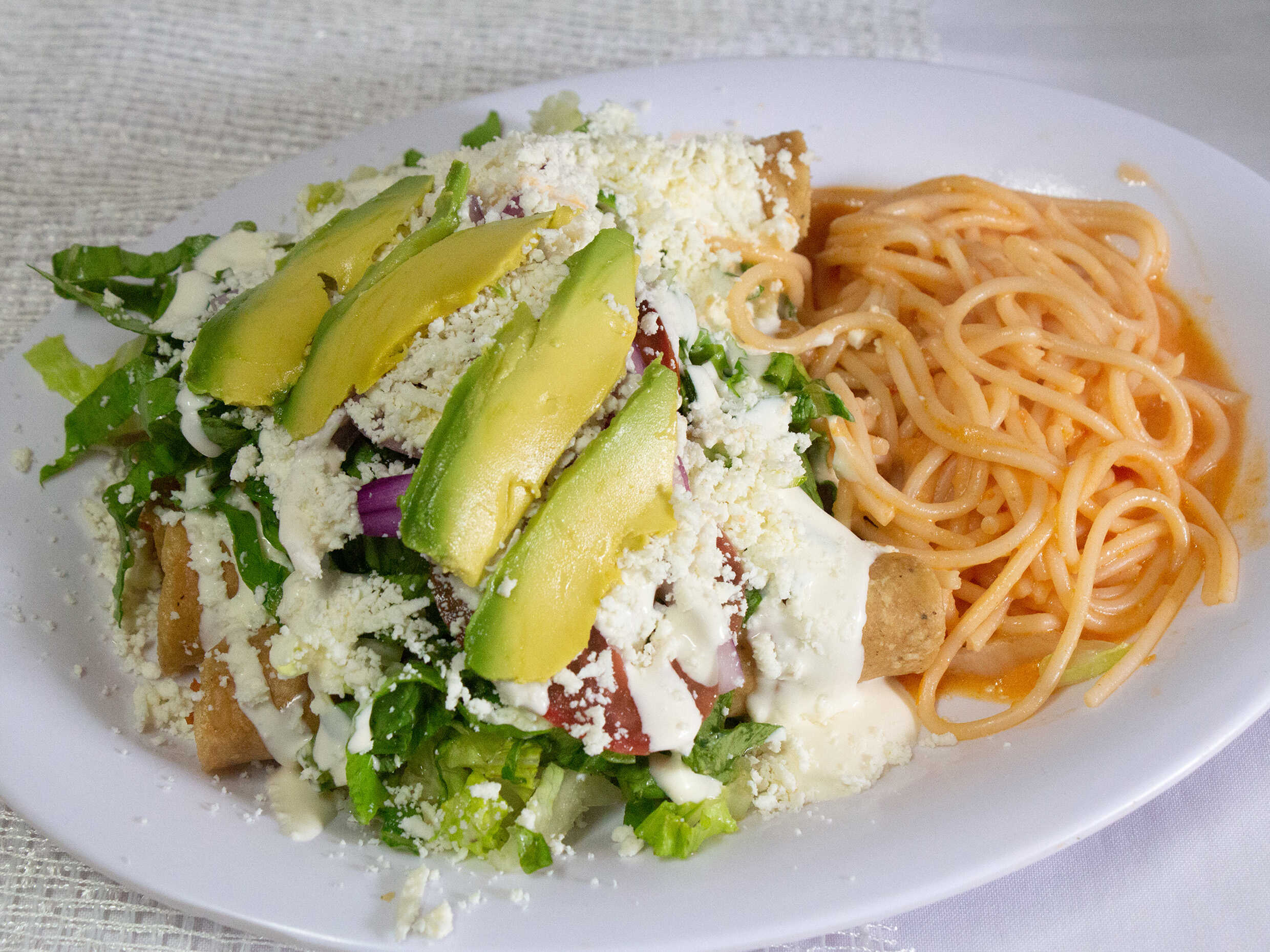 Enchiladas Suizas (porcion personal ) 3 Delliciosas Enchiladas Suizas, tortillas de maiz rellenas de pollo deshebrado , queso gouda fundido encima y spaguetti.