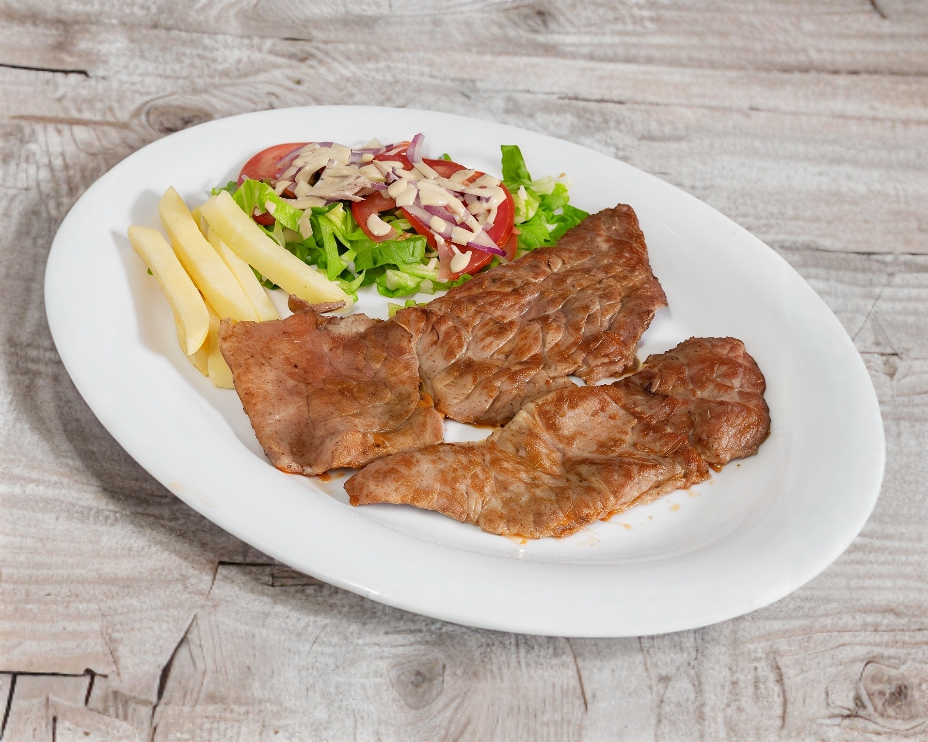 ensalada papas fritas y dos guarniciones ( arroz , frijoles , espaguety dos a elegir )