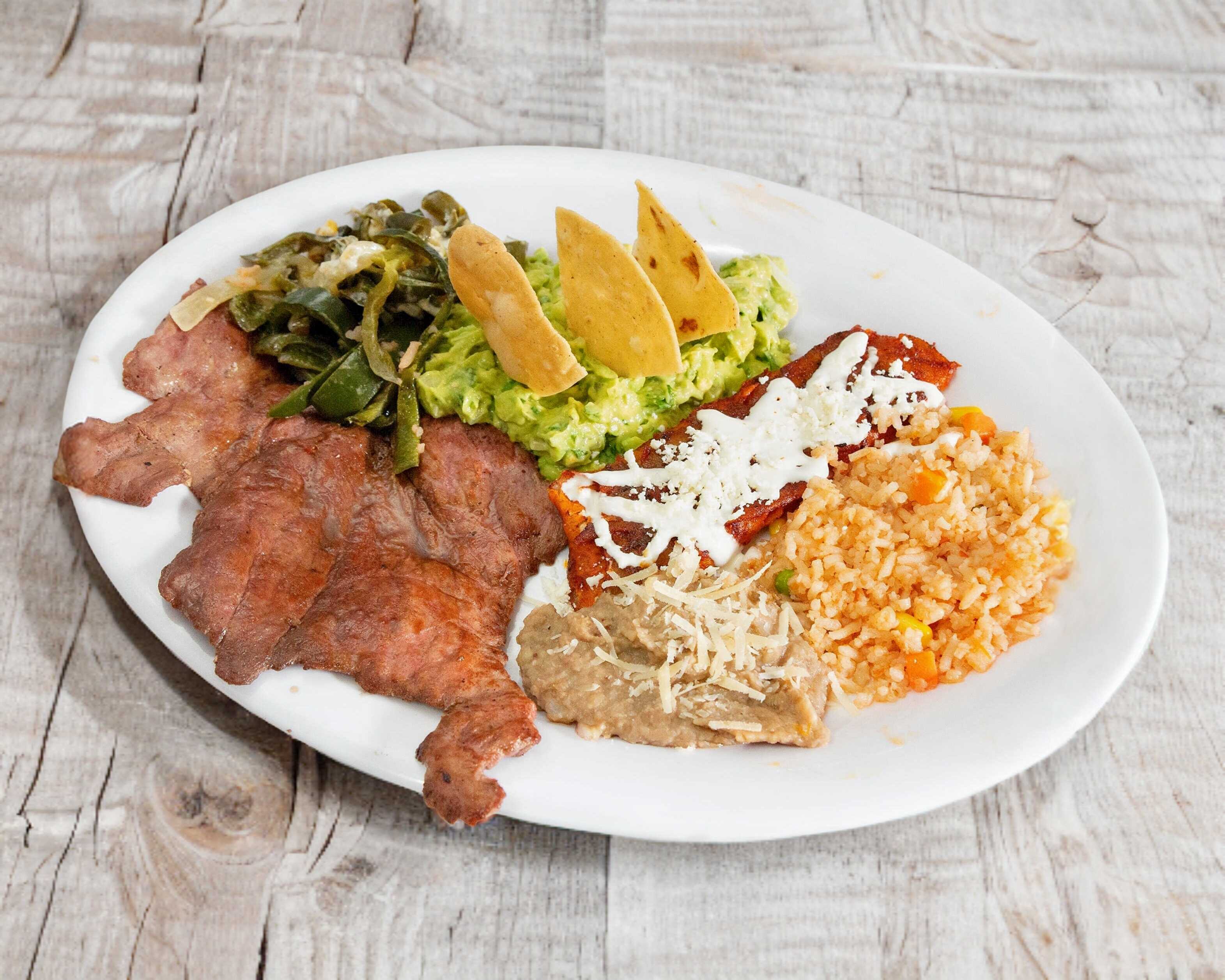 dos guisados dos guarniciones y una bebida (brocheta rajas aporreadillo carne de puerco chile negro pollo con mole chichsrron y cochinita pibil