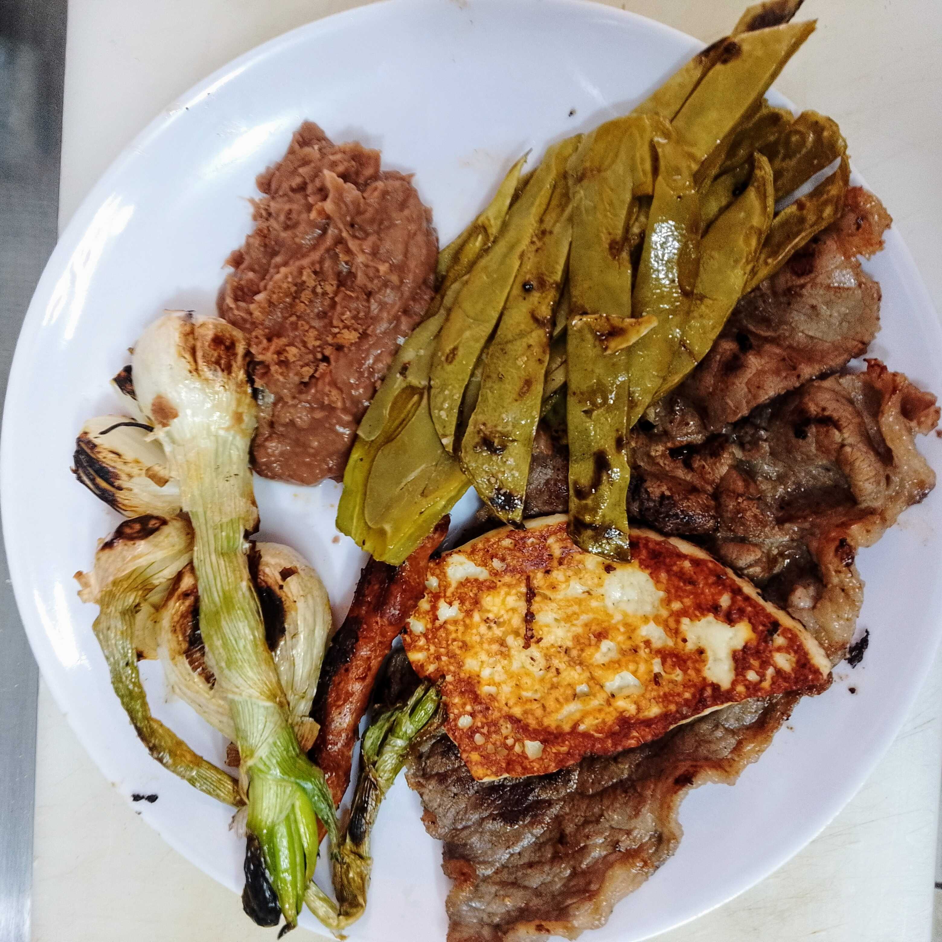 carne de res asada acompañada de frijoles, cebolla asada, queso asado y nopal