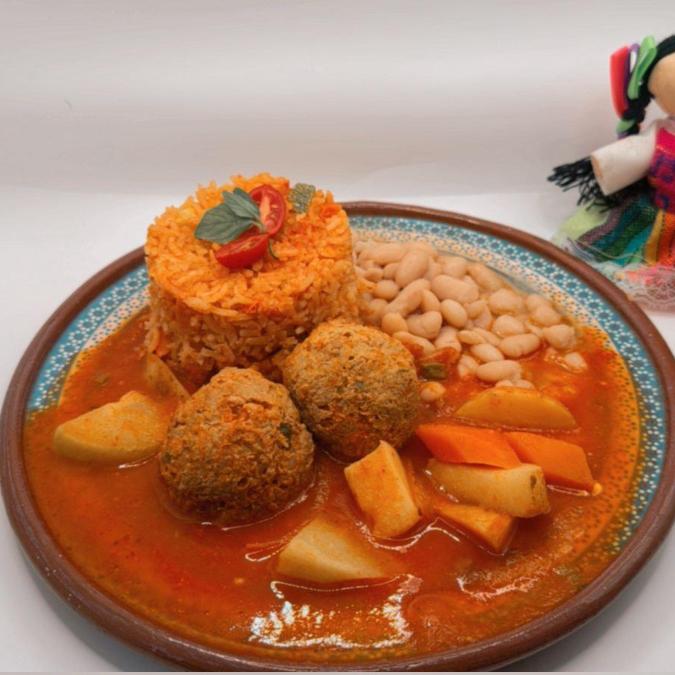 Albóndigas de carne molida sazonada, cocidas en un caldillo de jitomate con verduras. acompañadas de arroz y/o frijoles.