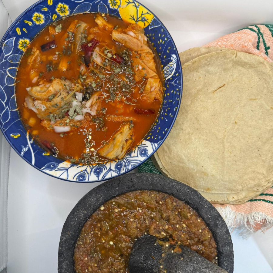 Rico menudo en plato grande, tortillas hechas a mano, acompañado de salsa macha de aceite y/o salsa molcajeteada.