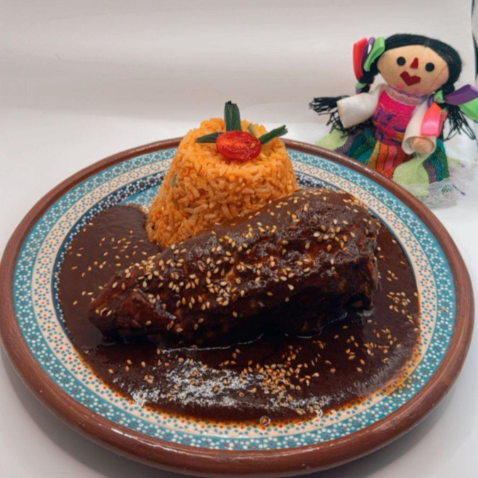Platillo tradicional preparado con carne de pollo bañada en mole casero a base de chiles secos y especias. servido con arroz y tortillas calientes. incluye pieza de pollo.