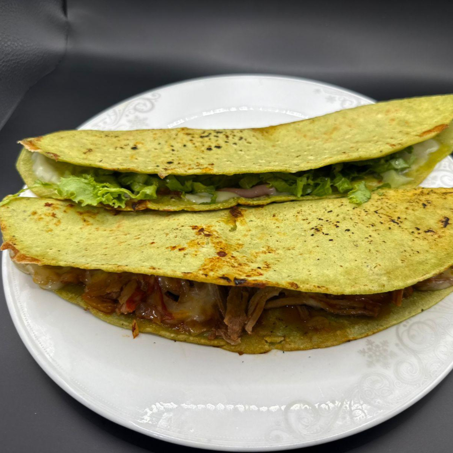 Tortilla grande de maíz o harina rellena de queso y guiso a elegir: pollo, chorizo, bistec, champiñones, flor de calabaza, huitlacoche o solo queso. servida dorada o al comal, sola o con lechuga, crema y queso; incluye salsas al gusto (molcajeteada y verde).
