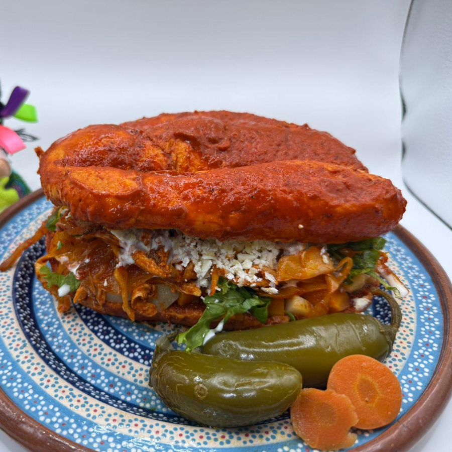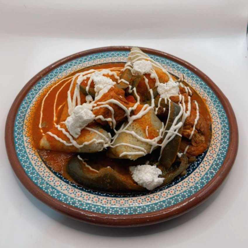 Pan relleno de papa con chorizo o picadillo, bañado en salsa de guajillo y dorado. servido con lechuga, crema, queso y salsa.