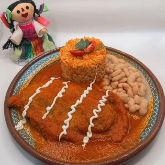 Riquísimos chiles poblanos asados y pelados, rellenos de atún o de queso, capeados en huevo y fritos, bañados en salsa de jitomate. acompañados de arroz o frijoles y tortillas hechas a mano.