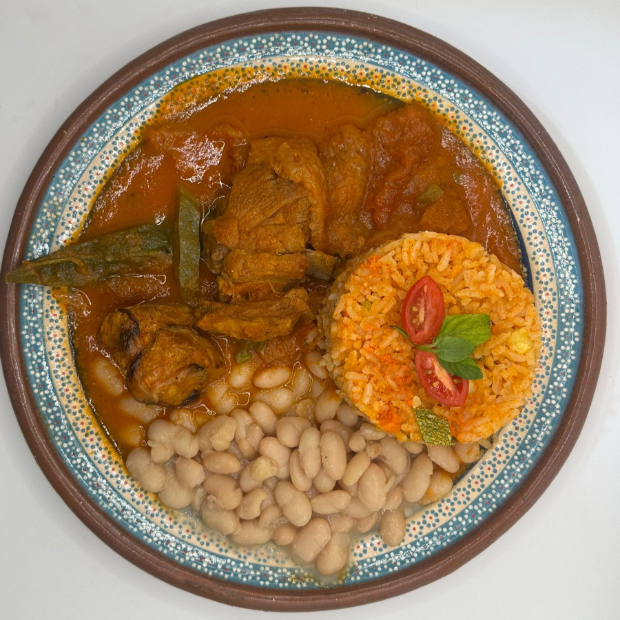 Costillas de cerdo guisadas en salsa roja, acompañadas de rajas asadas y bañadas en la misma salsa. servidas con arroz, frijoles y tortillas calientes hechas a mano.