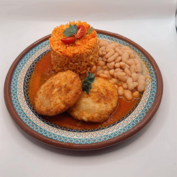 Tortas caseras hechas con papa cocida y sazonada, ligeramente fritas hasta obtener un exterior dorado y crujiente. servidas con arroz o frijoles y tortillas.