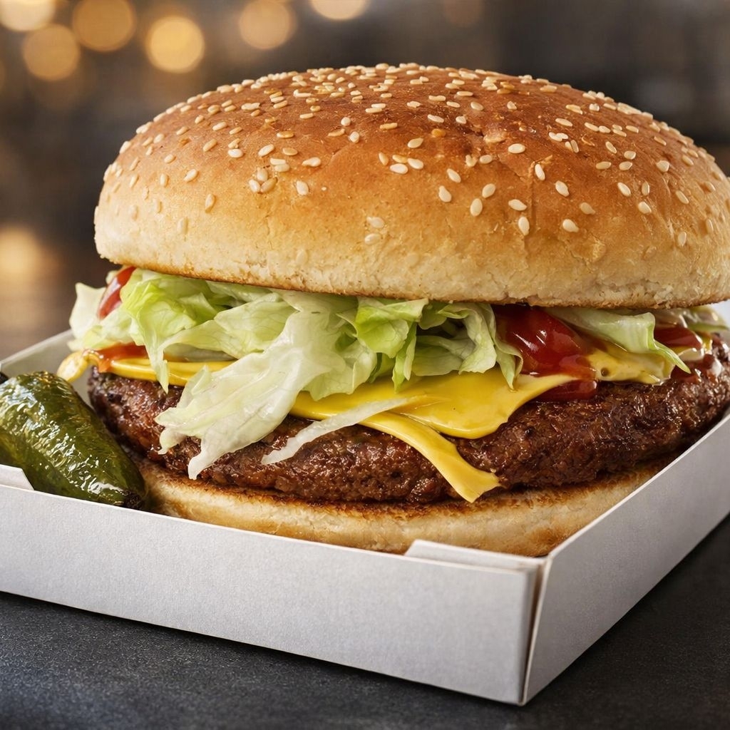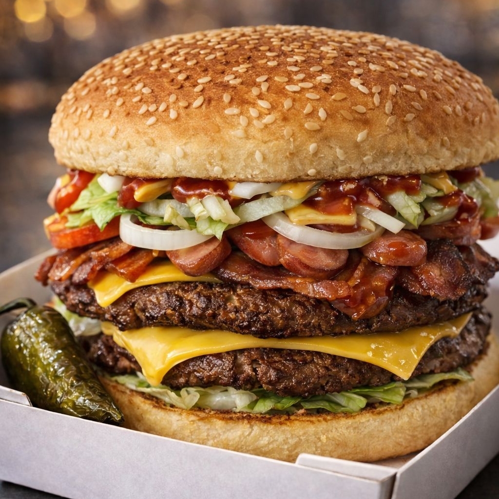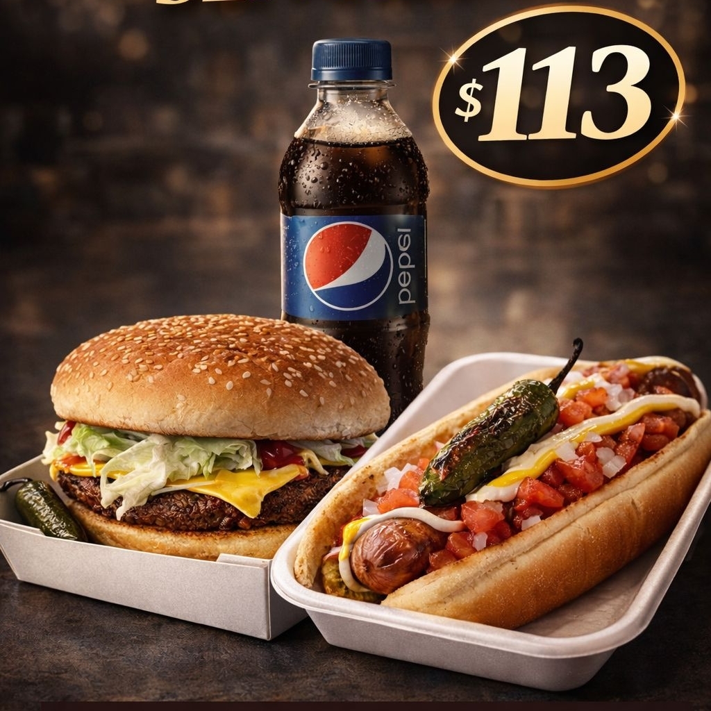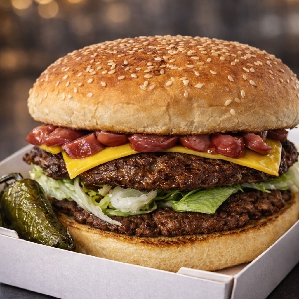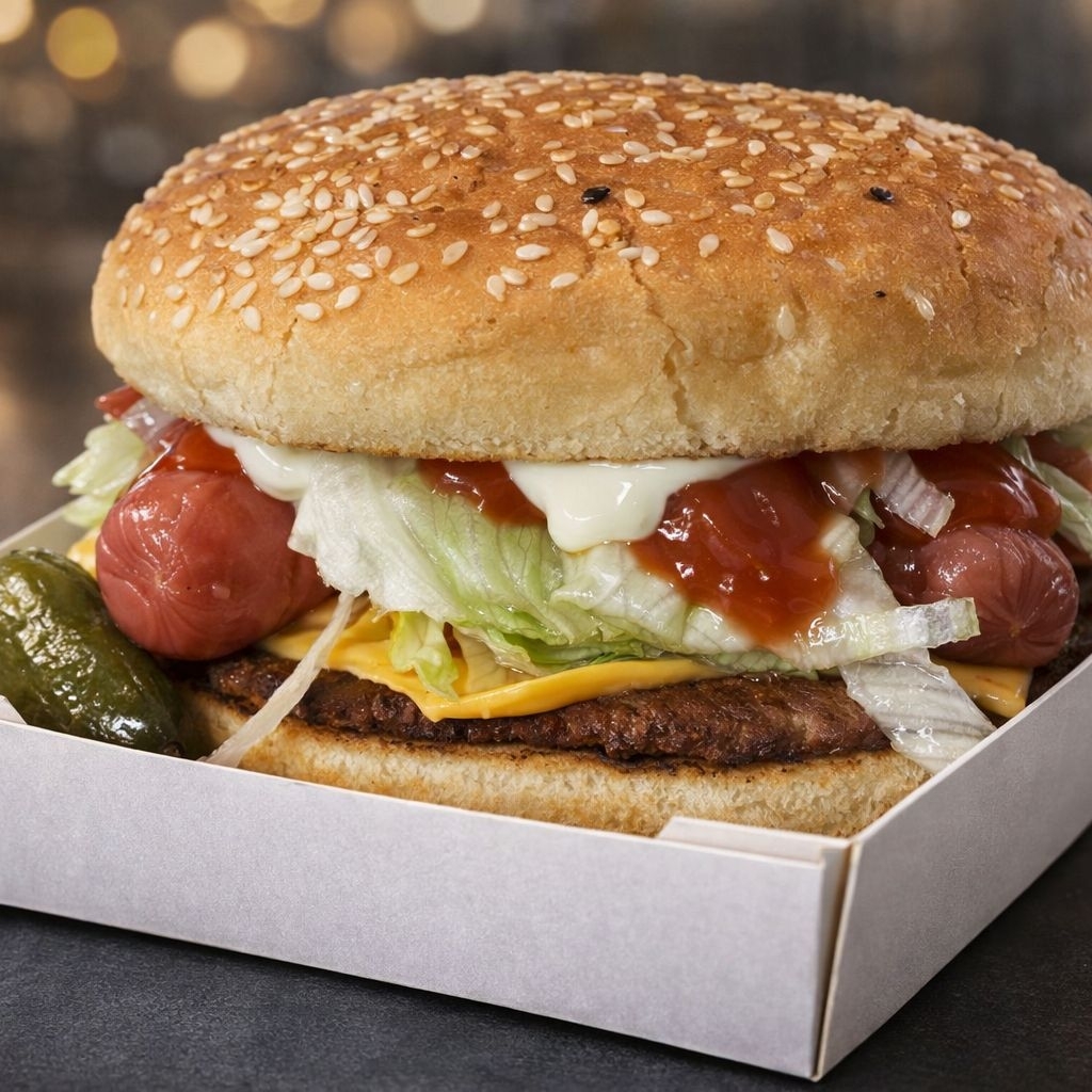 Pan grande de hamburguesa, doble carne, salchicha de pavo, queso amarillo, lechuga, jitomate, cebolla, mayonesa, ketchup, y mostaza