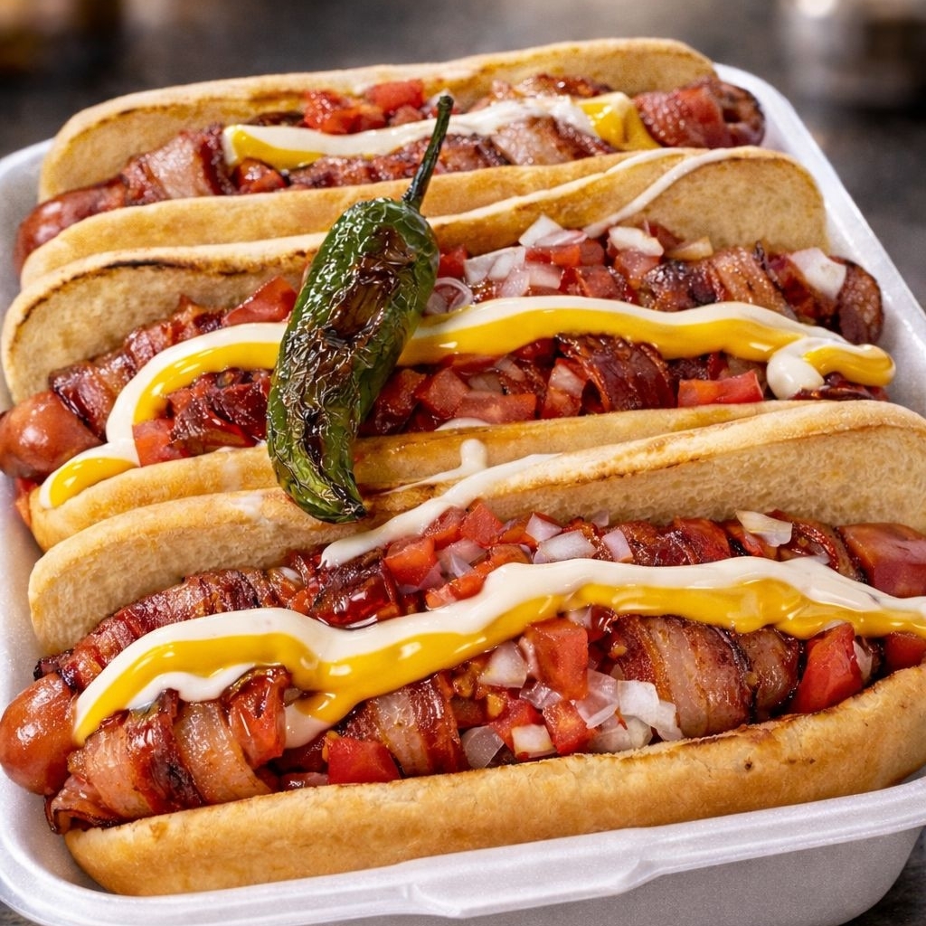 3 Hot Dogs con Tocino, pan grande, salchicha de pavo, jitomate, cebolla, ketchup, mayonesa y mostaza