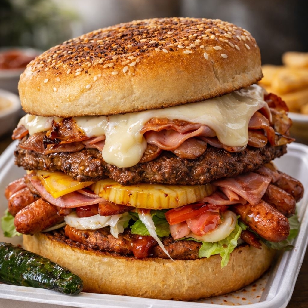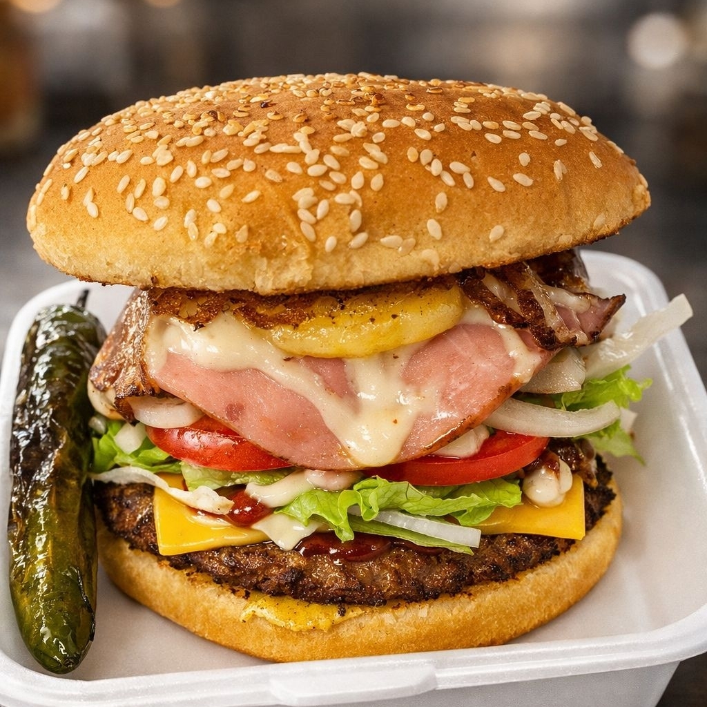 Pan grande de hamburguesa, doble carne, salchicha, tocino, queso asadero, jamón, piña, lechuga, cebolla, jitomate, ketchup, mayonesa, mostaza y chile tatemado aparte