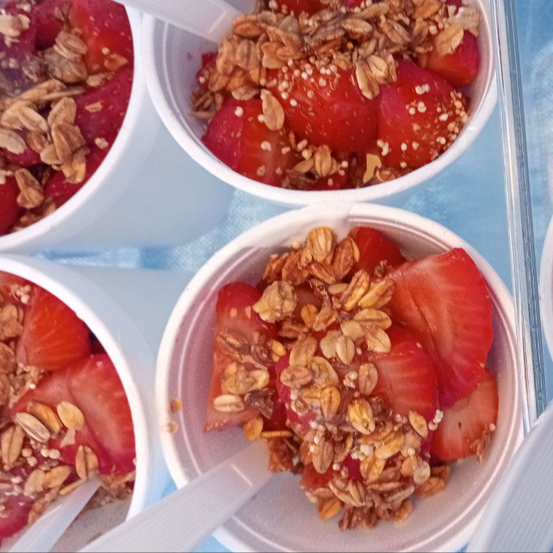 Vaso con Avena en leche, preparada con chía, fruta 🍌 y ligeramente endulzada. Porción individual