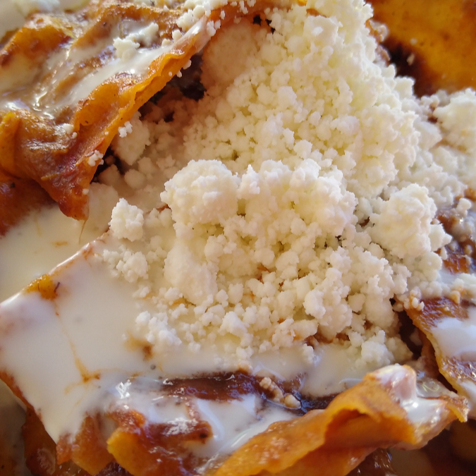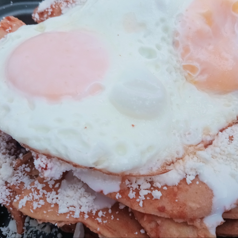 Totopos caseros bañados de salsa, acompañados con crema, queso, cebollitas y dos huevos. Porción individual