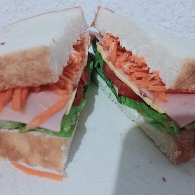 Pan de caja con aderezo, jamón, queso amarillo, lechuga, jitomate, cebollitas y zanahoria