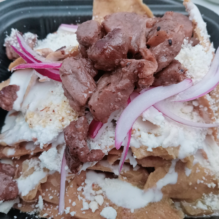 Totopos caseros bañados de salsa, acompañados con crema, queso y cebollitas, acompañados de arrachera. Porción individual