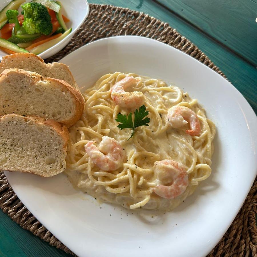Spaguetti 3 quesos con camarón y ensalada