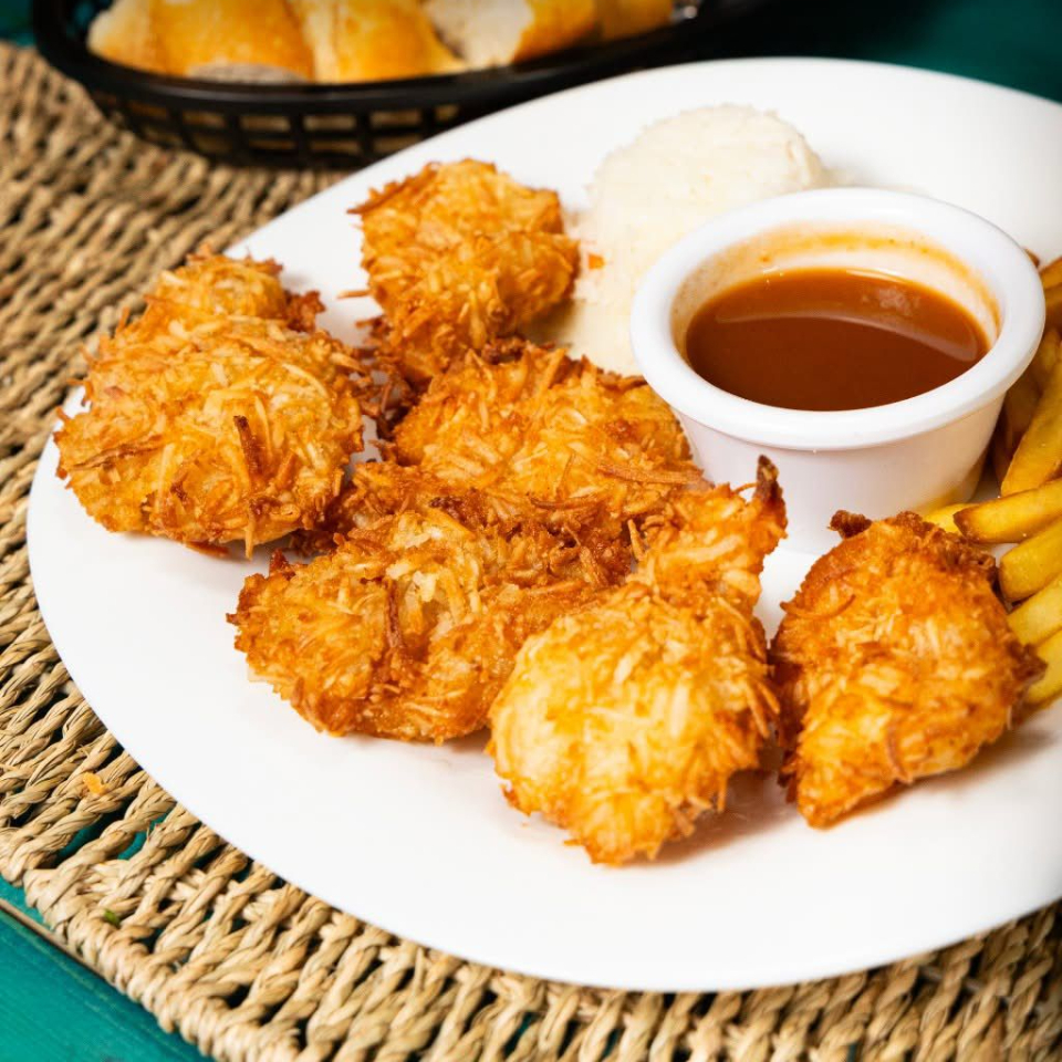 camarones rellenos de queso empanizados con coco rallado