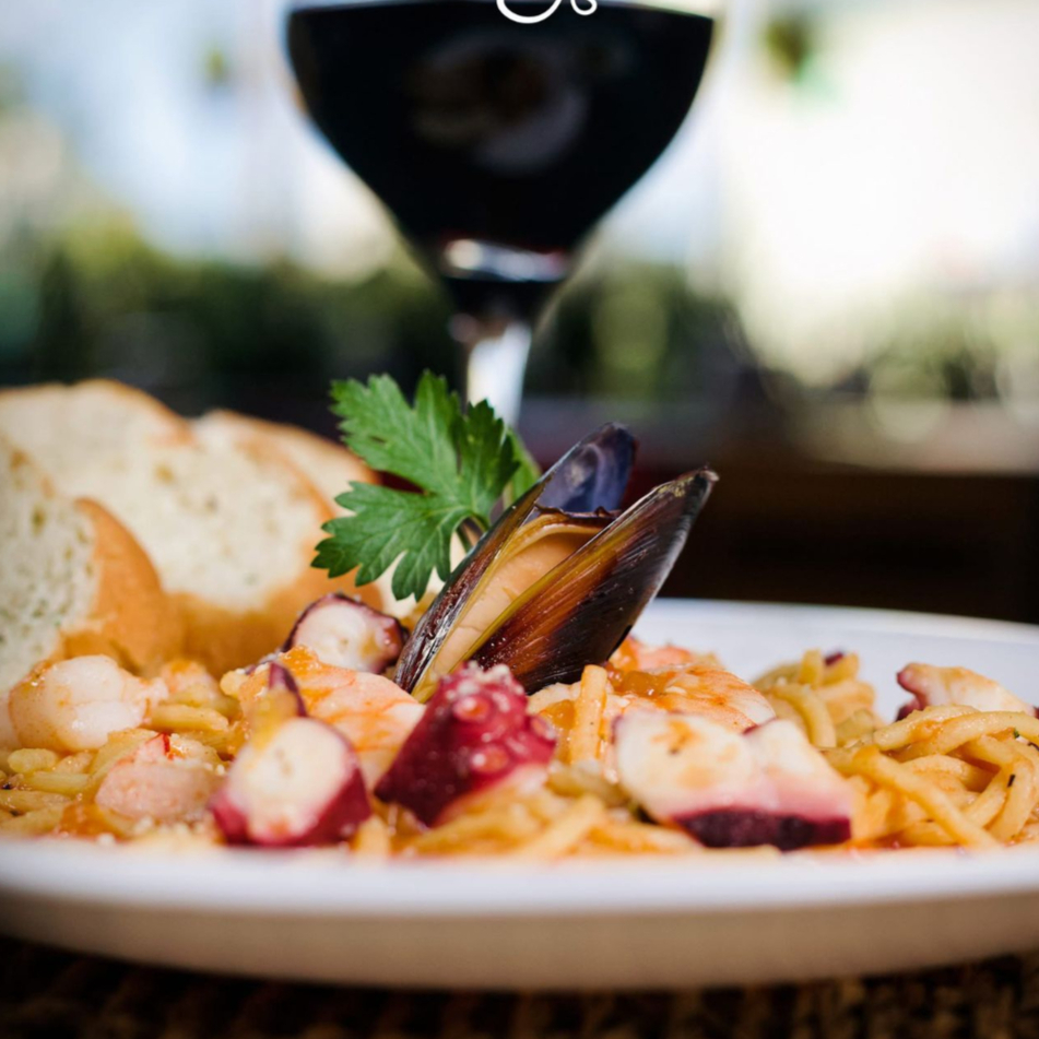 Spaguetti con camarones, pulpo y ostra en salsa de jitomate y especias