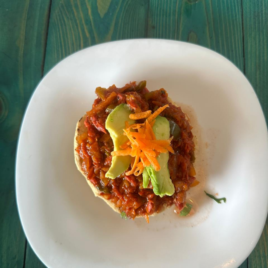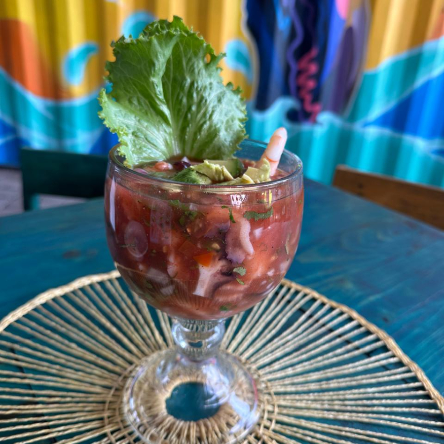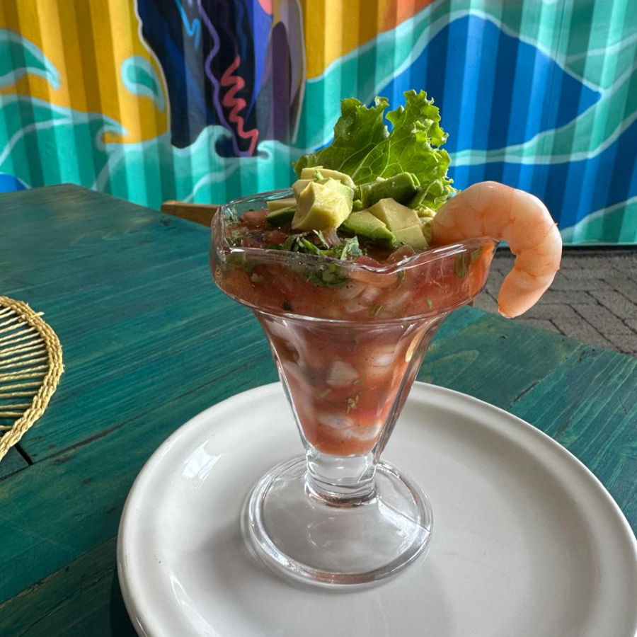 camarón, verdura, aguacate y salsas