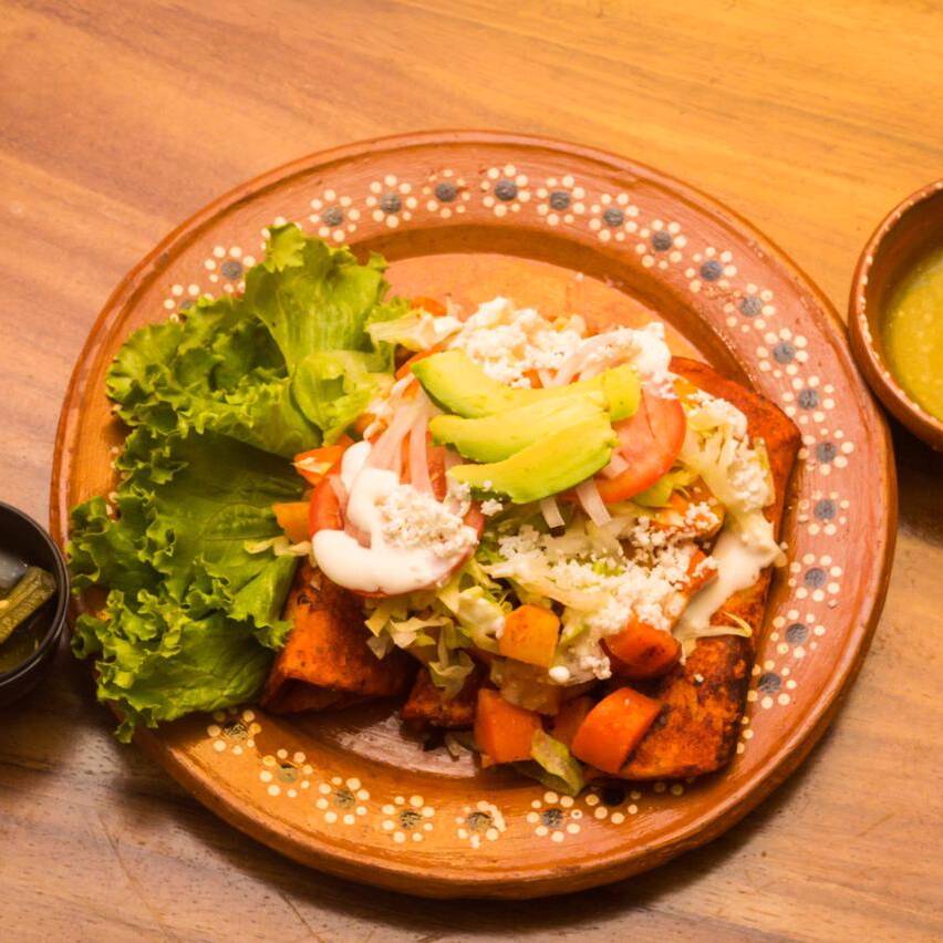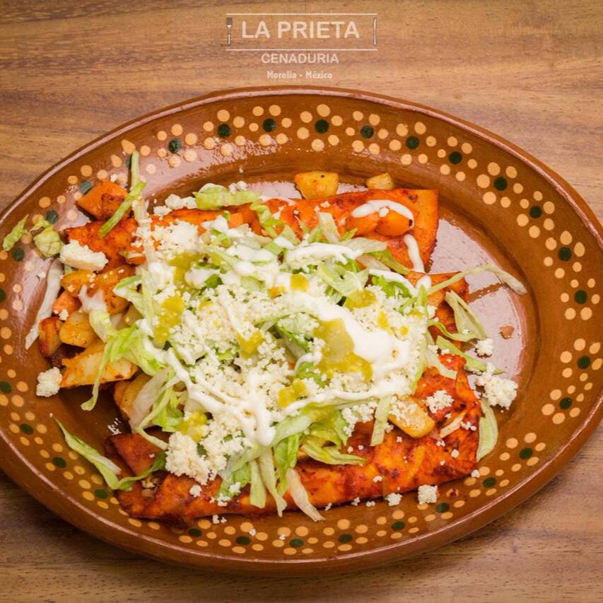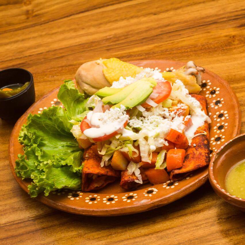 Enchiladas rellenas , acompañadas de papas, zanahorias, lechuga, queso, crema y salsa