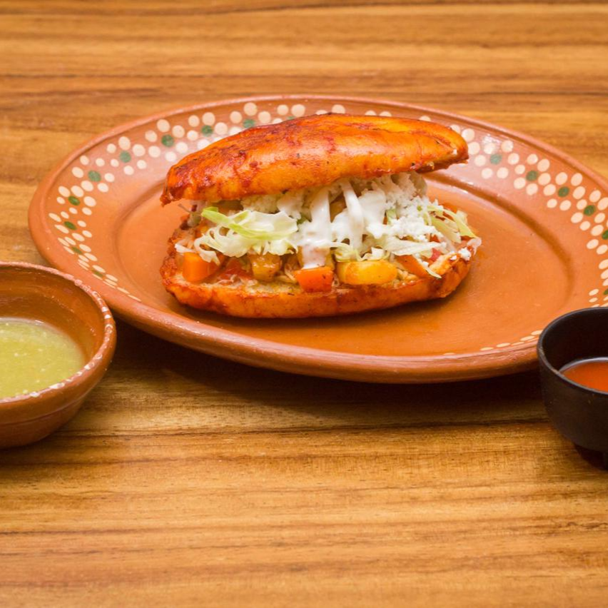Bolillo bañado de salsa de chile guajillo, relleno de guisado , acompañado de papas y zanahorias, lechuga, queso, crema.