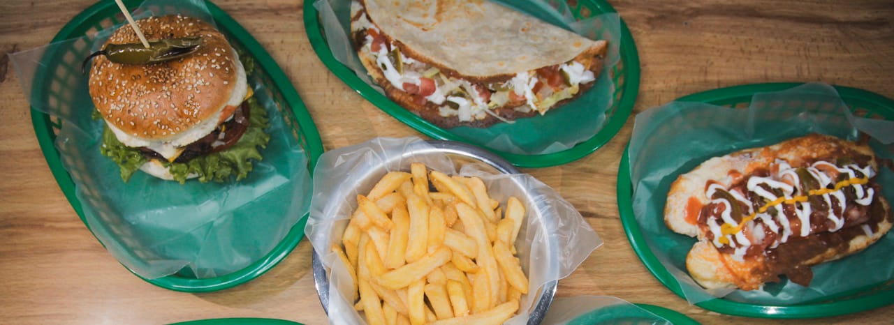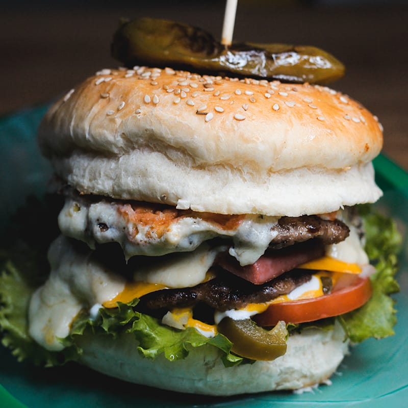 Deliciosa hamburgesa con carne de res, salchicha, queso asadero y queso amarillo.