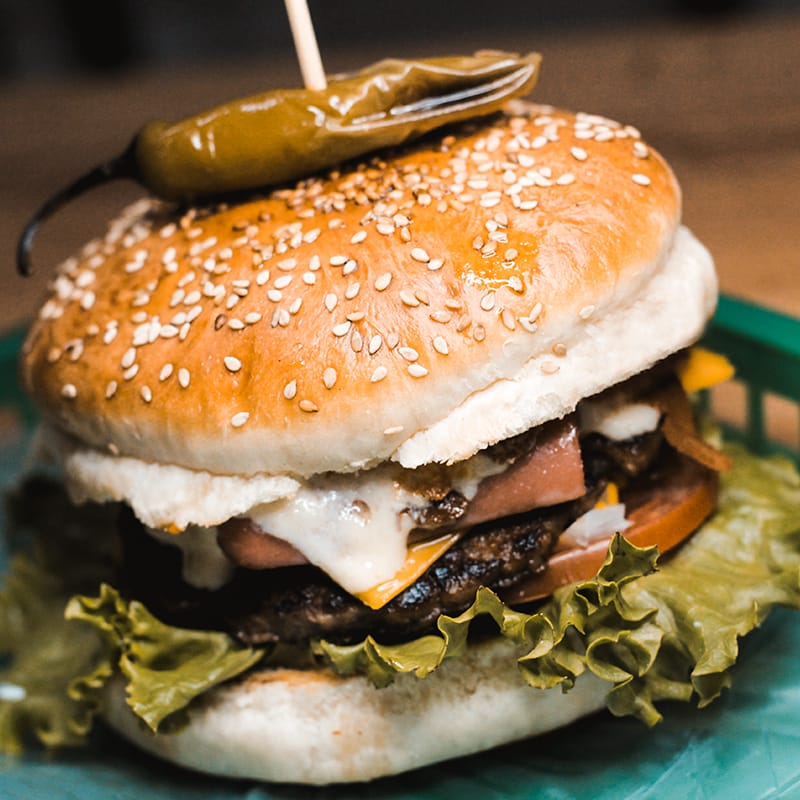 Deliciosa hamburgesa con carne de res, queso asadero y queso amarillo.